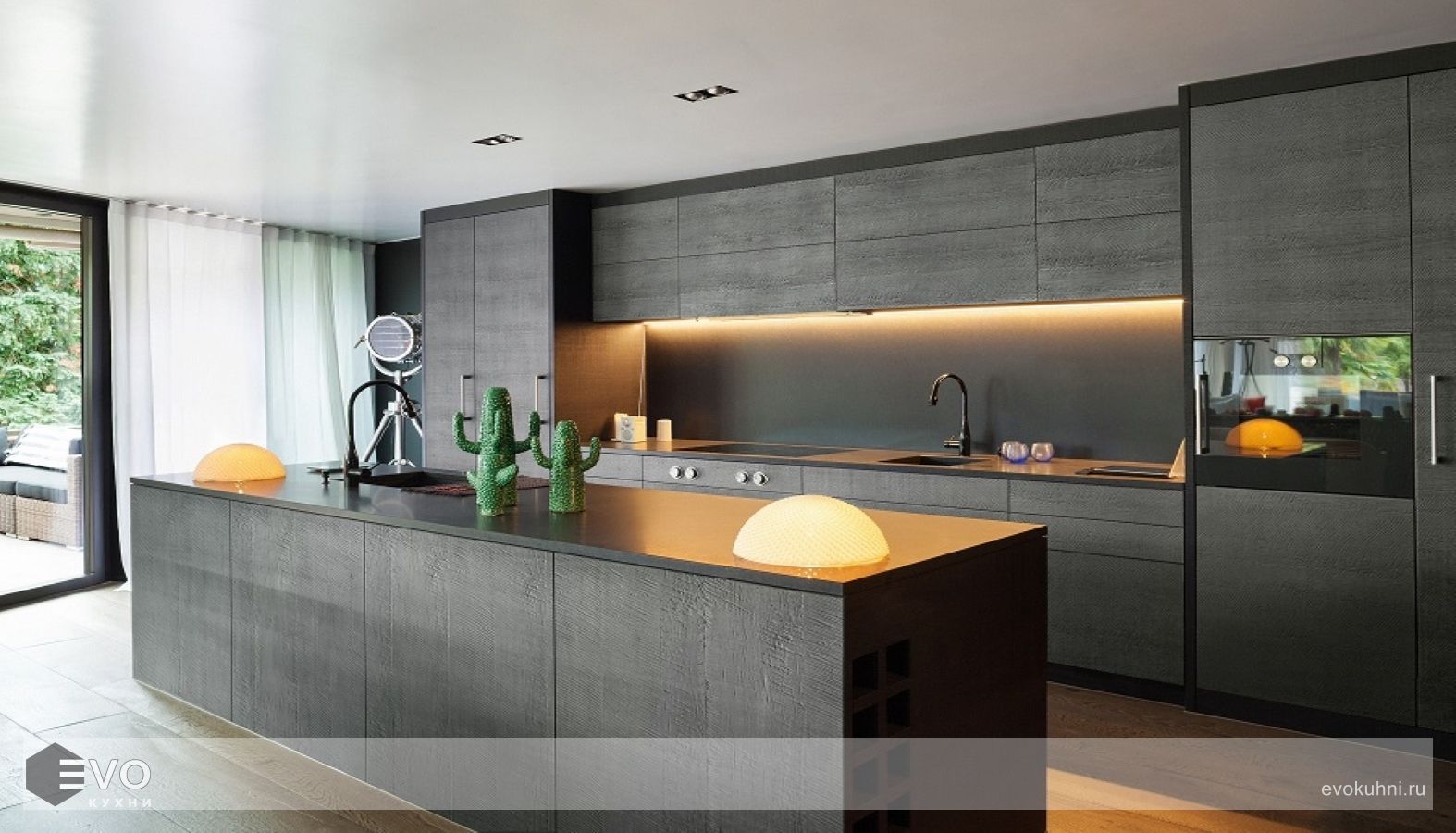 Прямая кухня хай-тек с островом с рельефными фасадами Cross Line Grey – эффект пиления поперек волокна древесины.