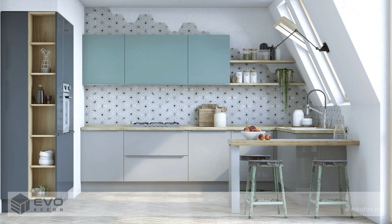 Нам понравился модерн-дизайн кухни Арт, но у нас стена с вытяжкой была особенной. Сделали индивидуальный проект по размерам, а стойку немного укоротили. Полки для бокалов добавили отдельно под стойкой — супер удобно.