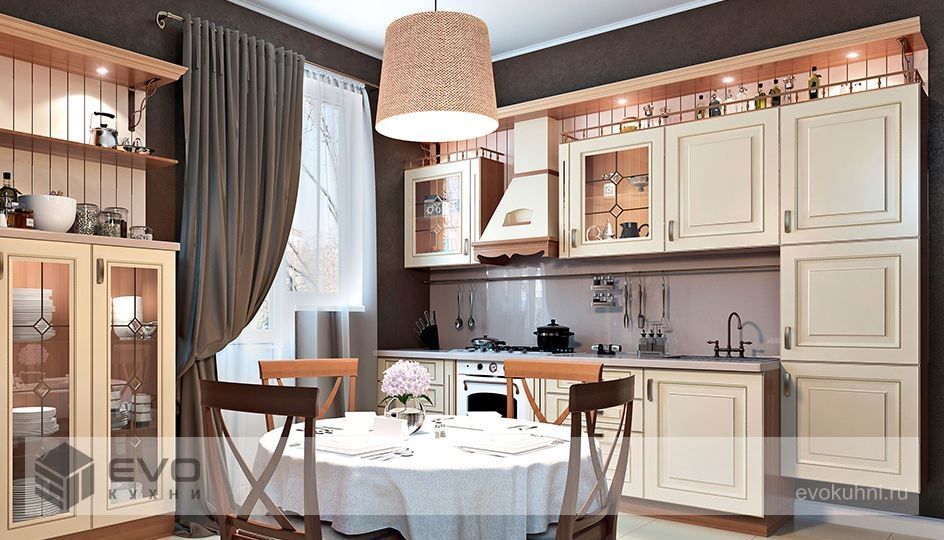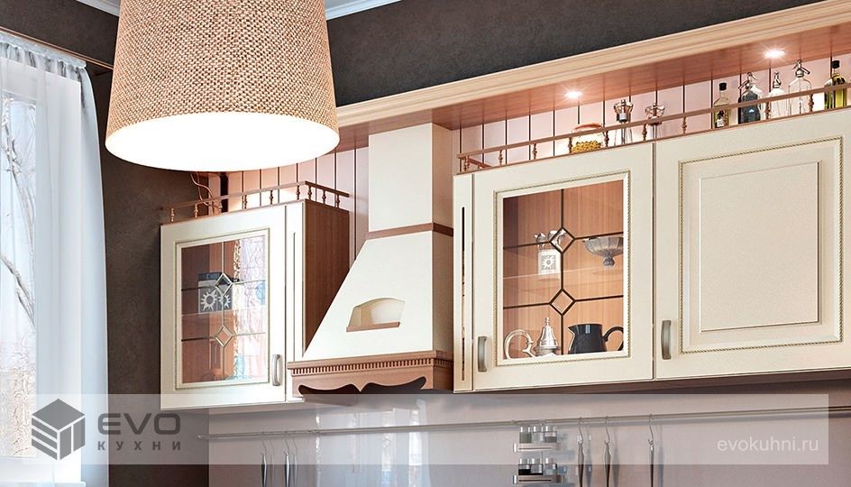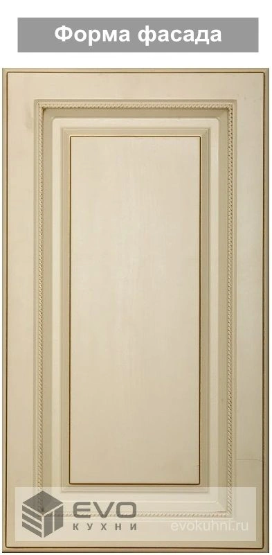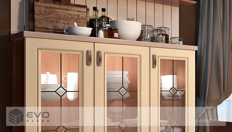 Светлые фасады с оттенком топленого молока в сочетании с простой, ясной и глубокой фрезеровкой, придают кухне «Кальдера» элегантность и утонченность. Прямые линии филенки с рисунком в виде косички и патинированием добавляют образу очарования. Возможны фасады с витражами.