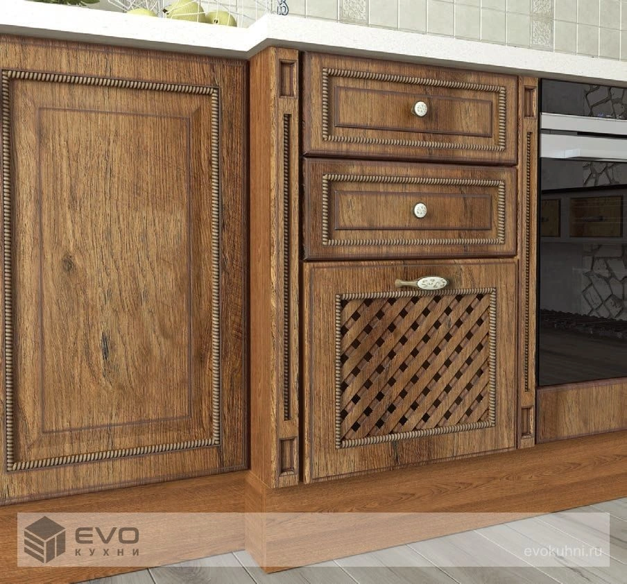 Данная модель прекрасно впишется в интерьер небольшого загородного дома. Прямые формы напольных и навесных шкафов, отличающихся своей практичностью, сдержанные декоративные элементы, а также фасады, покрытые патиной и имитирующие грубоватую текстуру натуральной древесины, невероятно гармонично дополняют друг друга.