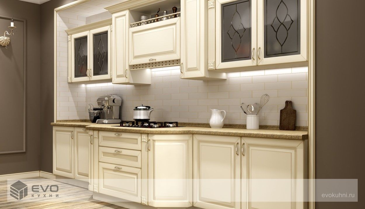 Кухонный гарнитур Виолент, образец современной итальянской классики. Интересная форма фасада, добавление эффекта старения, большой выбор цвета отделки. Казалось бы что ещё нужно? Однако такие кухни наиболее эффектно смотрятся в больших помещениях, поэтому если у Вас небольшая кухня, то рекомендуем переключиться на более демократичную модель, либо на классические кухни из массива дерева. Основа фасада Виолент - традиционная для серии эмаль EVO панель МДФ на которую наносится любой фоновый цвет, а затем в углубления фрезеровки затирается патина золотого, серебряного, бронзового или коричневого цвета.