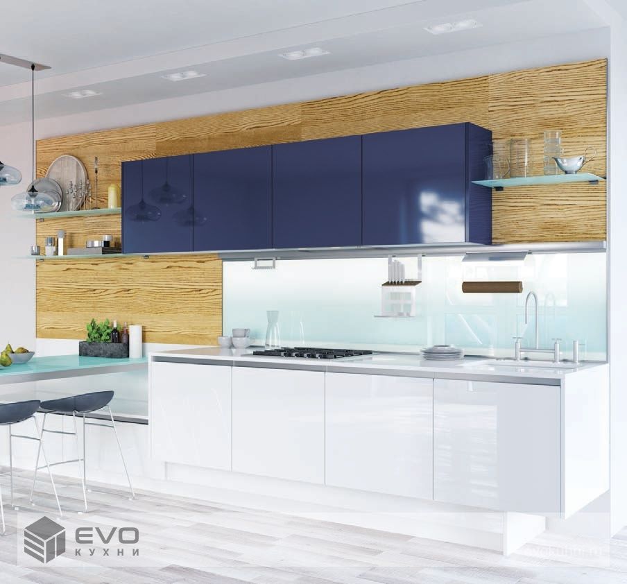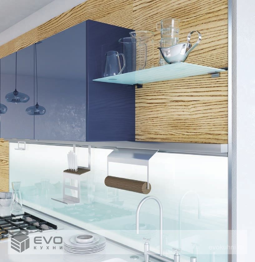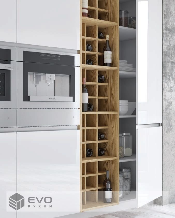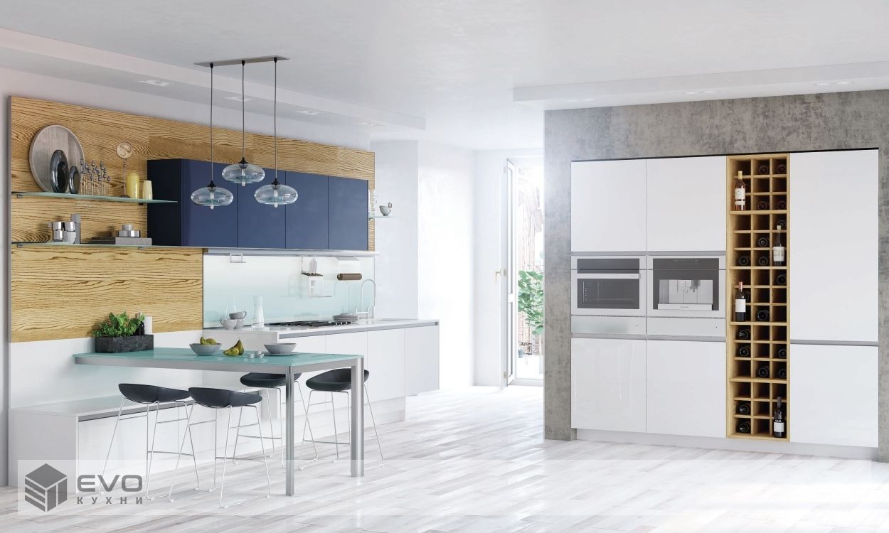 В представленной стильной модели высококачественные фасады из стекла в освежающих модных оттенках скомбинированы со шпонированной стеновой панелью наилучшим образом. Идеально вмонтированные в фасады скрытые ручки-профили и расположенные в нише пеналы придают оптическую однородность помещению. Встроенный винный стеллаж из шпонированной ДСП заслуживает особого внимания.