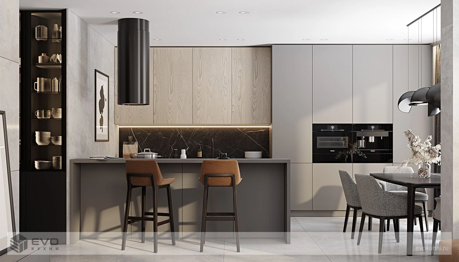 Кухня Бриг – это интересное решение для оформления современного интерьера. Глухие фасады серого цвета и оттенка натурального дерева позволяют не только организовать удобную зону хранения, но и визуально расширить пространство. Акцент в такой кухне сделан на практичность и минимализм. Освежить интерьер можно при помощи яркого текстиля или необычной обеденной зоны.