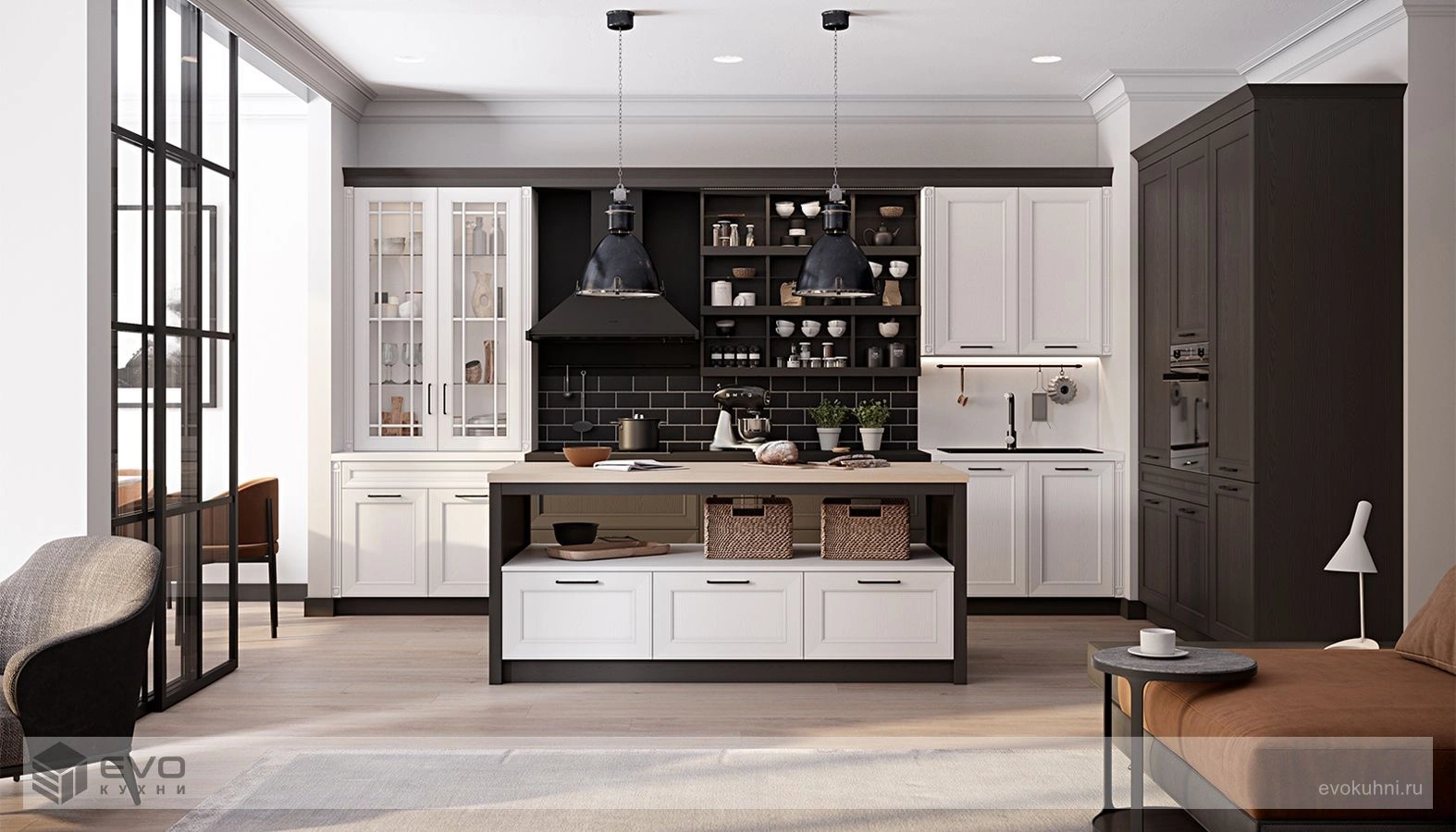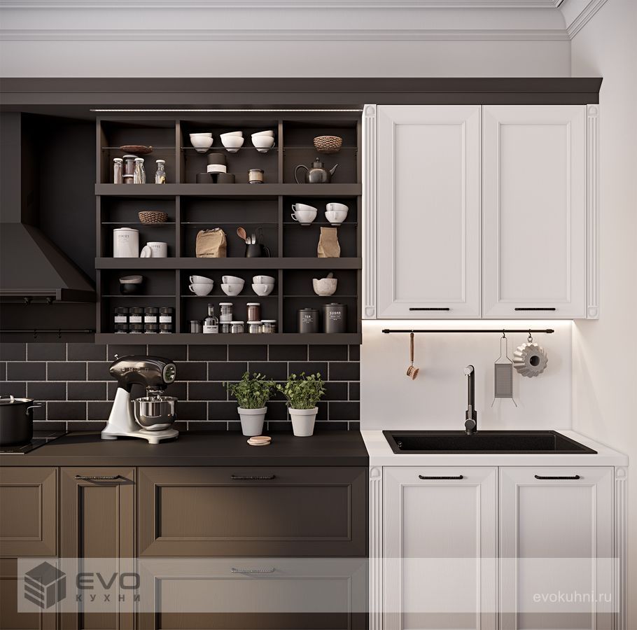 Кухня Северин займет достойное место в кухне-гостиной или квартире-студии. Смелое сочетание белого и коричневого цветов обеспечивают вертикальное деление пространства на две части.