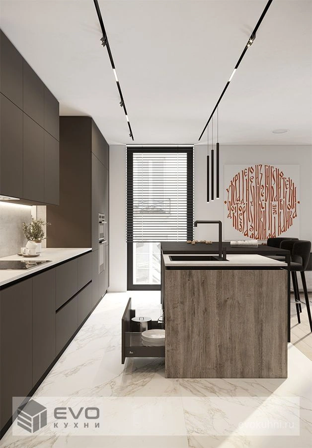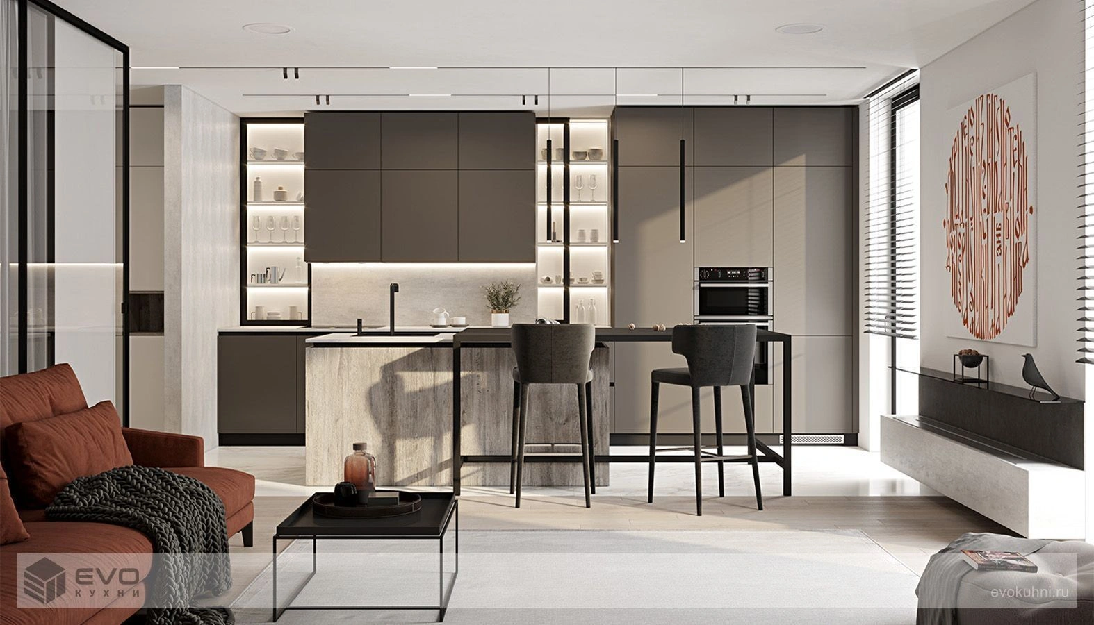 Кухня Кентукки – интересное решение в стиле модерн. Сочетание поверхностей шоколадного цвета эффектно смотрится с полками со стеклянными фасадами.