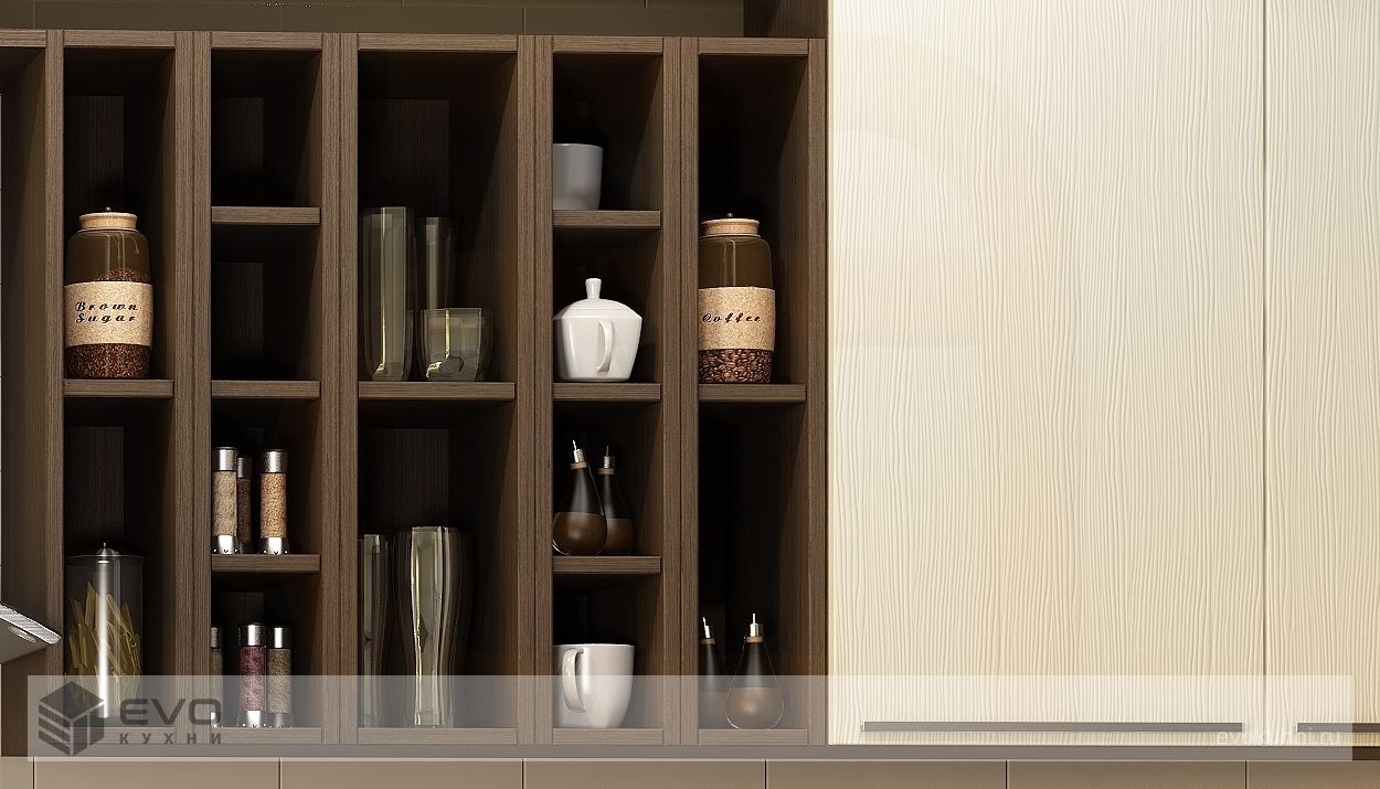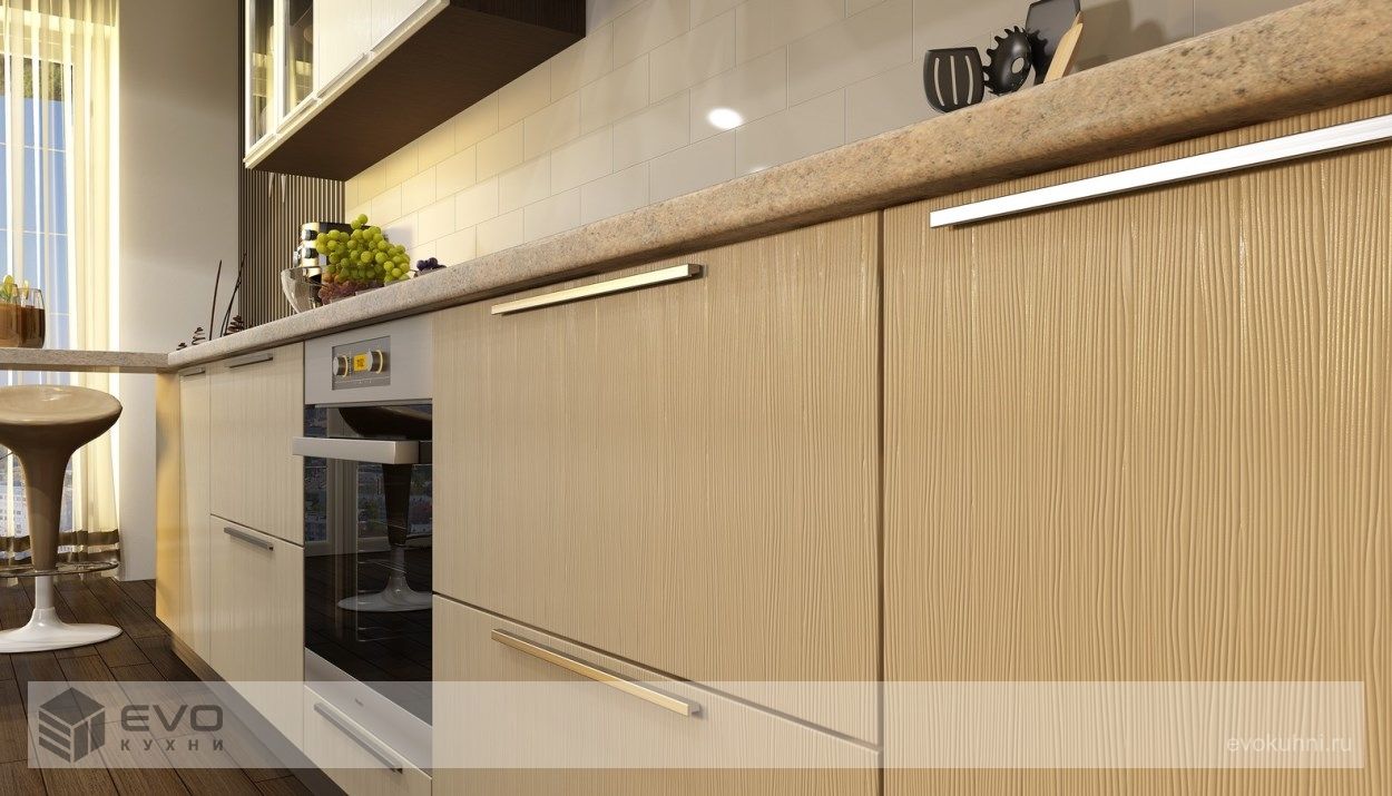 Кухня с фасадами «Хомо» прекрасно подходит для помещений различных типов и размеров. Благодаря спокойным оттенкам этот гарнитур придает кухне уют и создает в ней домашнюю обстановку. В то же время он имеет оригинальный вид вследствие необычного сочетания расцветок. Мебельные фасады из пластика позволяют легко подобрать цвет бытовой техники, например, холодильника, духового шкафа.