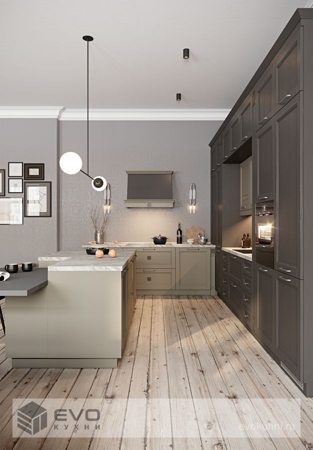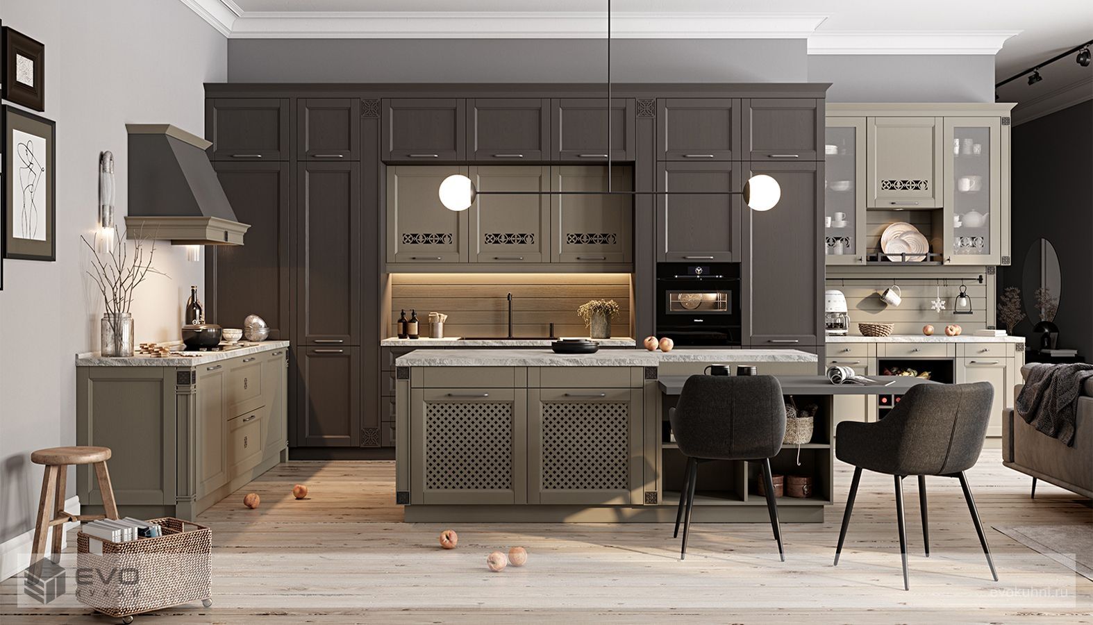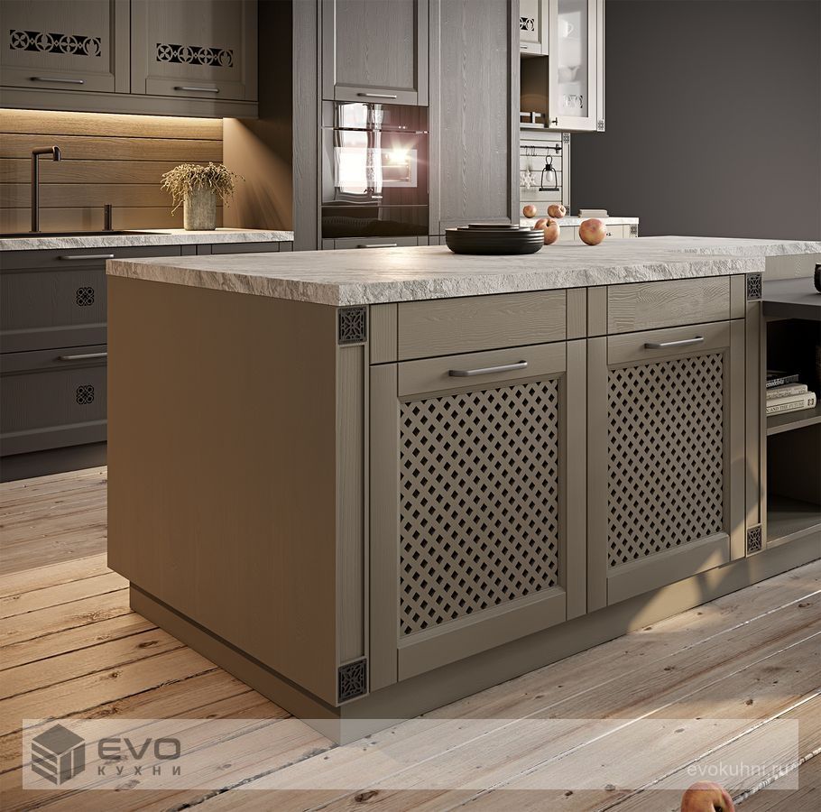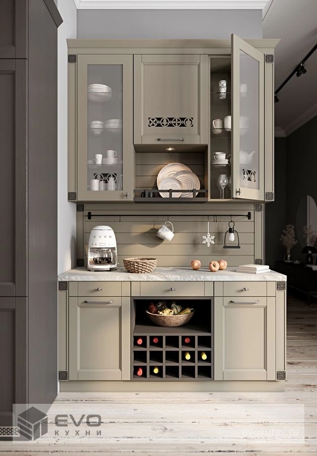 ДЕКОРАТИВНЫЕ ЭЛЕМЕНТЫ Опора декоративная ОД-10 (820), цвет вставки 120; панель декоративная БПД-10-1; пилястра #13, цвет вставки 120; балюстрада прямая «Техно»; плинтус мебельный ПМ-5; багет ЛГБ-1 прямой; вагонка, цвет NCS S 6005-G80Y; декоративный короб HB «Пьемонт» (900) под встраиваемую вытяжку, цвет купола / вставки 120
