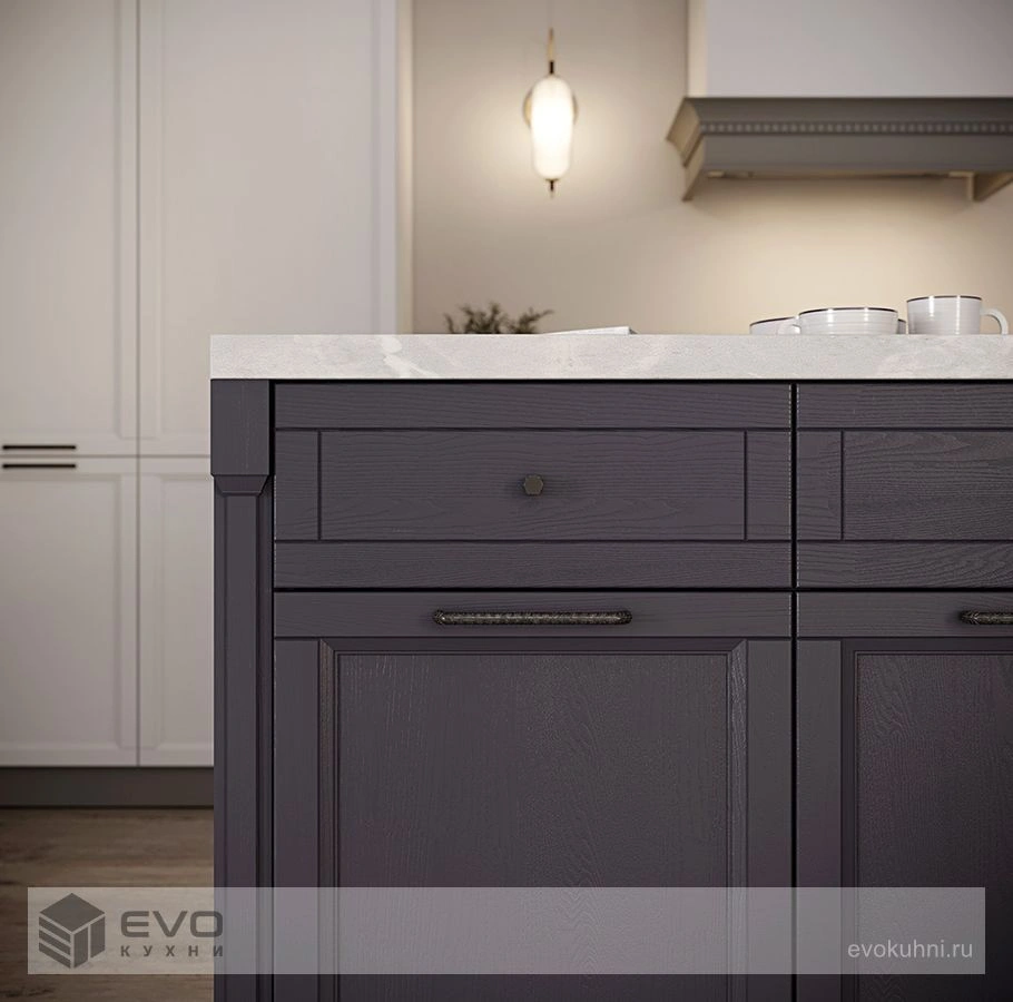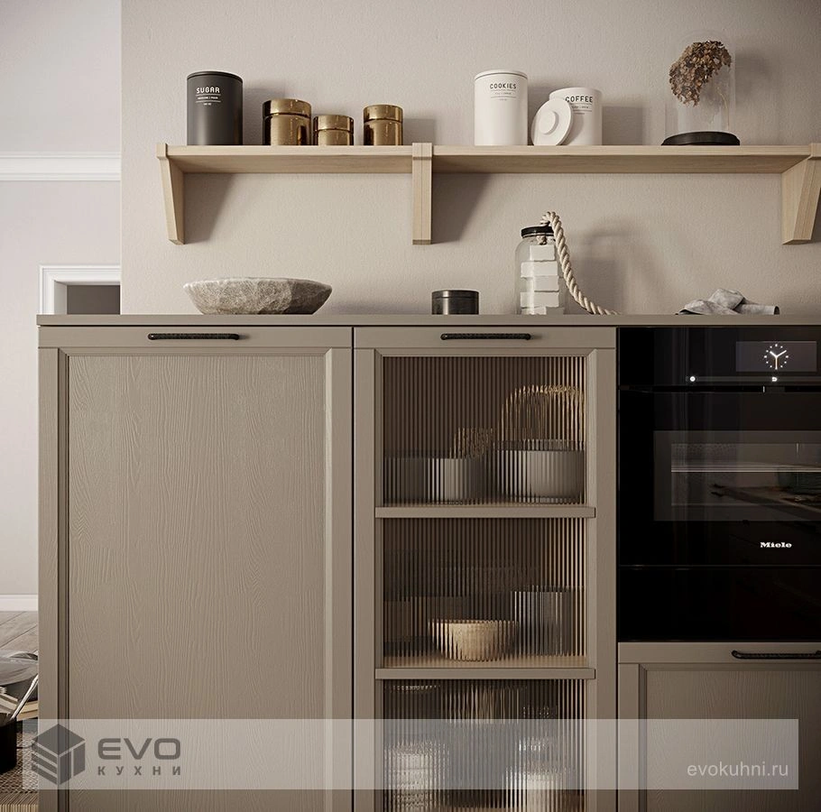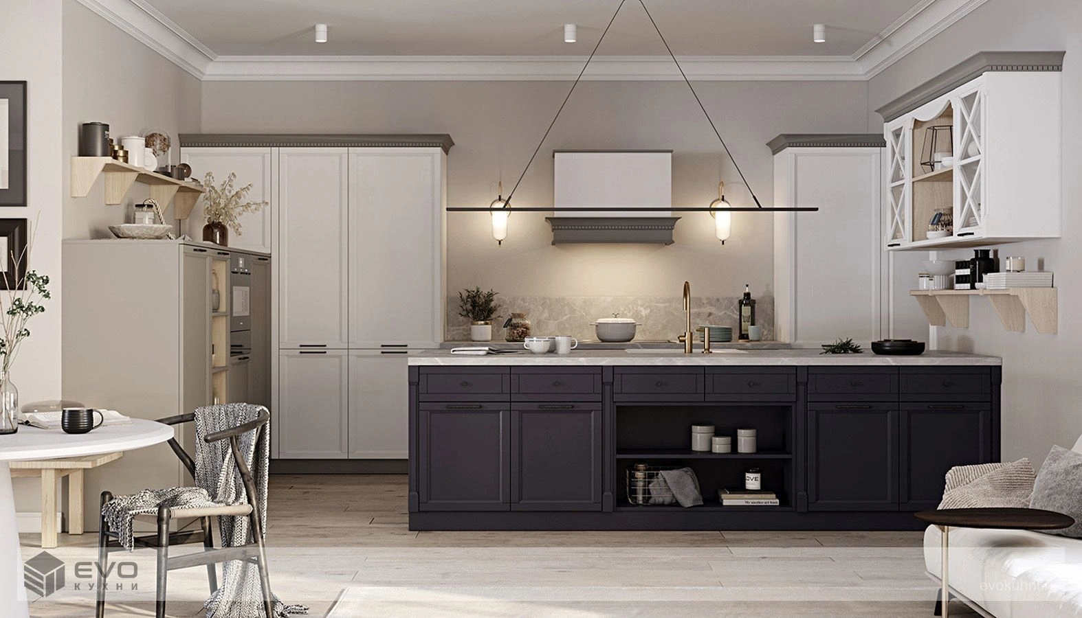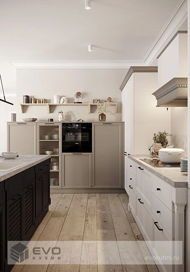 ДЕКОРАТИВНЫЕ ЭЛЕМЕНТЫ Опора декоративная ОД-12 (820), цвет 143; пилястра #14, цвет 143 / NCS S 7010-R50B; багет Б-3 прямой, цвет NCS S 3500-N; декоративный короб HB «Орлеан» (900) под встраиваемую вытяжку, цвет 143 / NCS S 3500-N; навесная полка ЛГП-1 (450, 600, 900), цвет #189 воскобейц Белый; накладка декоративная НМ-1 (ширина 896 мм), цвет 143