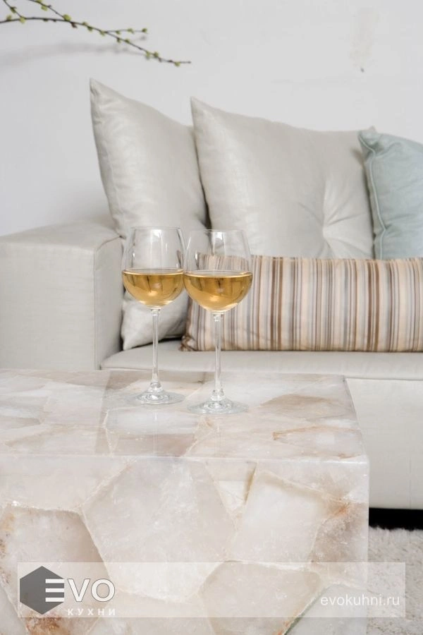 Белый камень Caesarstone 8441 Дымчатый кварц сделан из фрагментов натурального кварца. Этот минерал показан здесь во всей красоте своего полупрозрачного туманного узора.