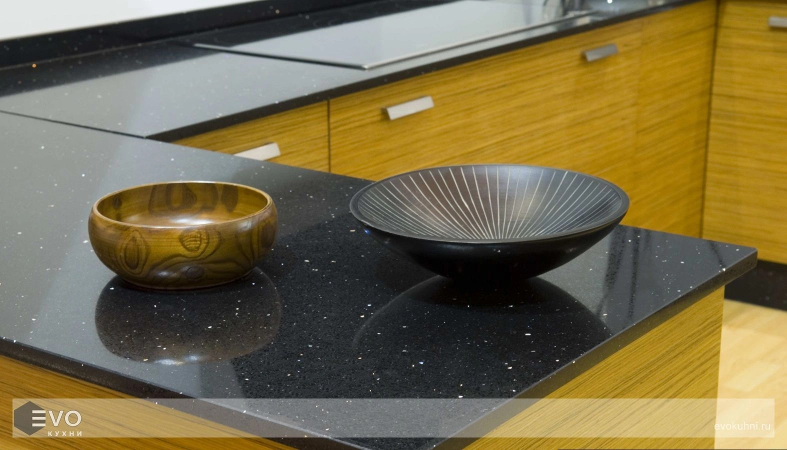 - Столешница для кухни из кварца будет очень удобна в использовании, потому что ее невозможно поцарапать ножом.
