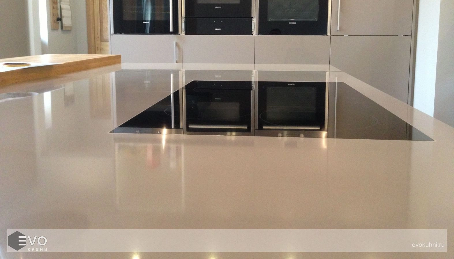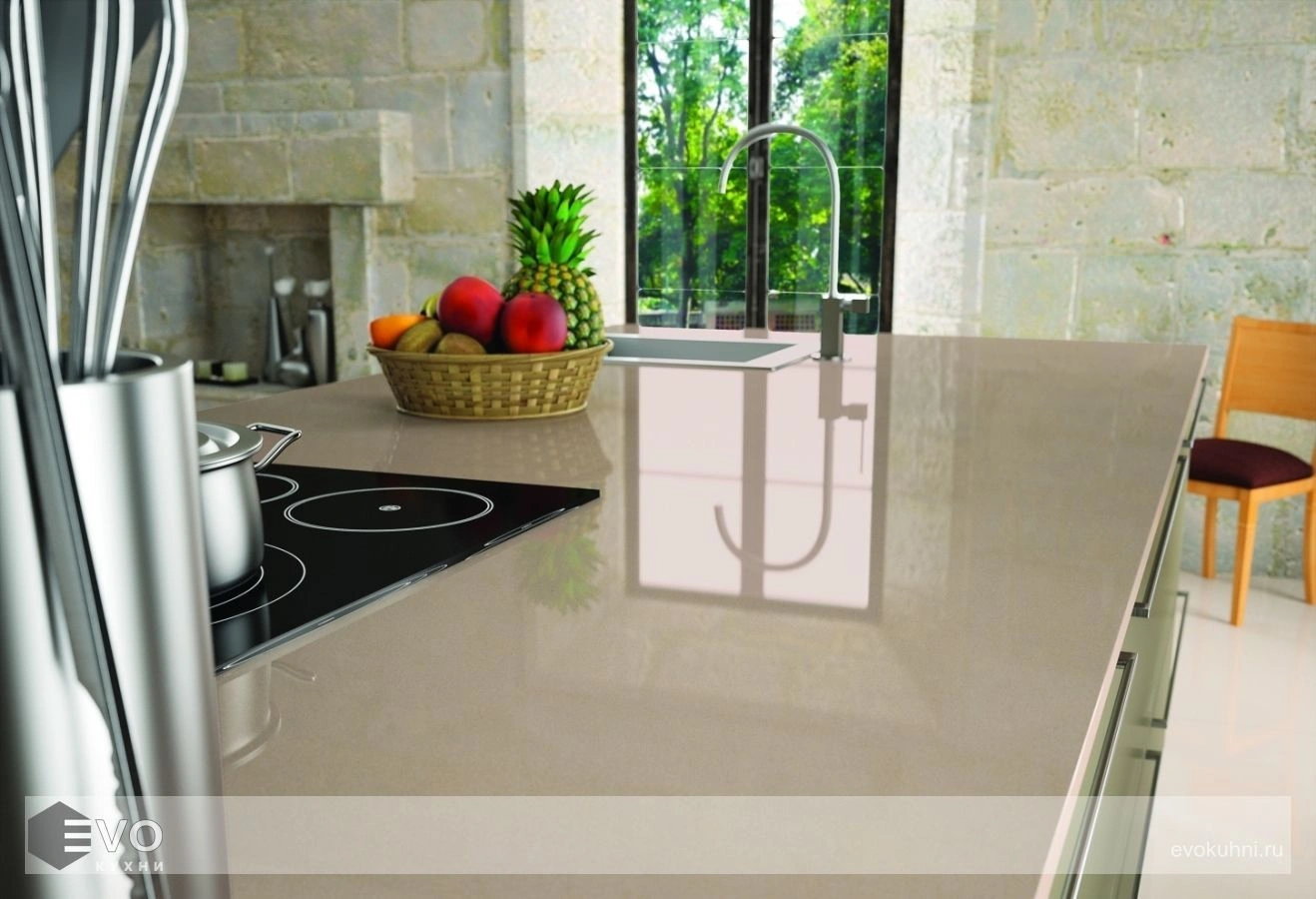 - Столешница для кухни из кварца будет очень удобна в использовании, потому что ее невозможно поцарапать ножом.
