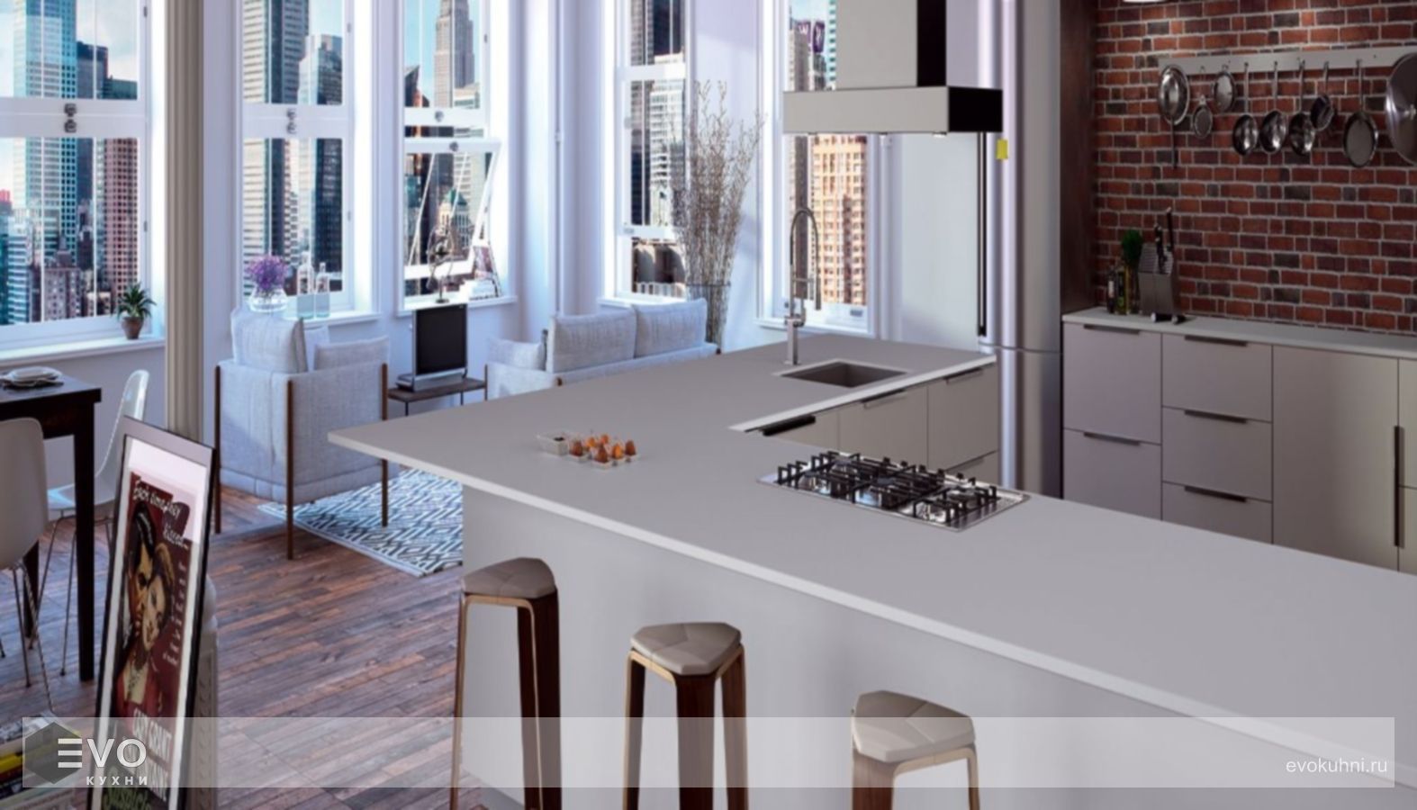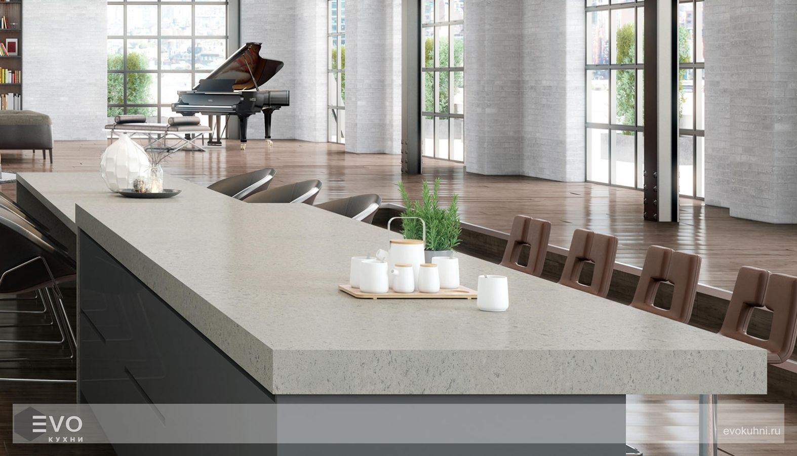 - Столешница для кухни из кварца будет очень удобна в использовании, потому что ее невозможно поцарапать ножом.