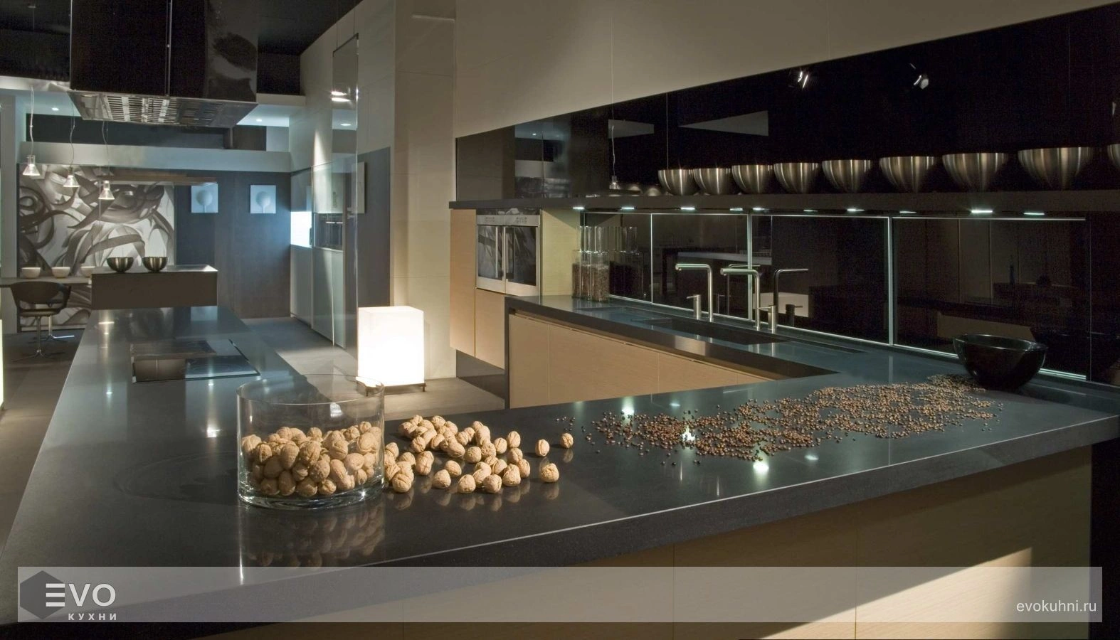 - Столешница для кухни из кварца будет очень удобна в использовании, потому что ее невозможно поцарапать ножом.