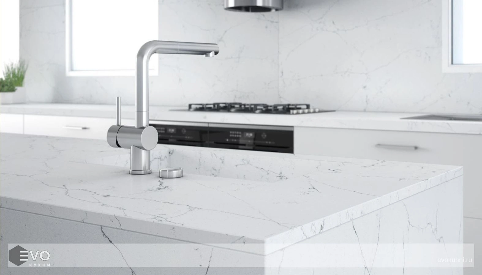 • Столешница для кухни из кварца будет очень удобна в использовании, потому что ее невозможно поцарапать ножом.