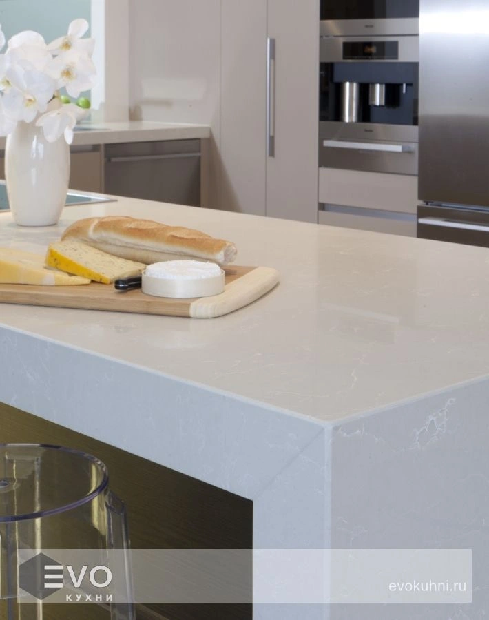 • Кварцевый агломерат не впитывает запахи. Из-за отсутствия пор в материале — запахи не останутся ни от продуктов, ни от помещения, где находится материал. Можно рассыпать, разлить, размазать что угодно на поверхности изделия и не чувствовать въевшийся запах.