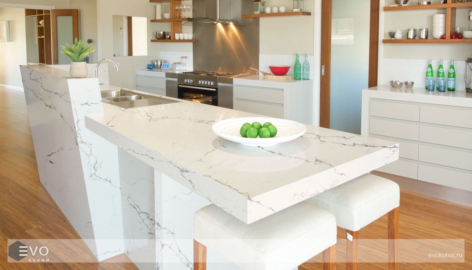 - Устойчивость к бытовым кислотам. Как уже было отмечено, кварцевый камень не имеет в своей структуре пор и трещин, что позволяет избегать негативного влияния на поверхность любых пищевых и химических продуктов. Благодаря этому никаких пятен и других загрязнений никогда не появится.