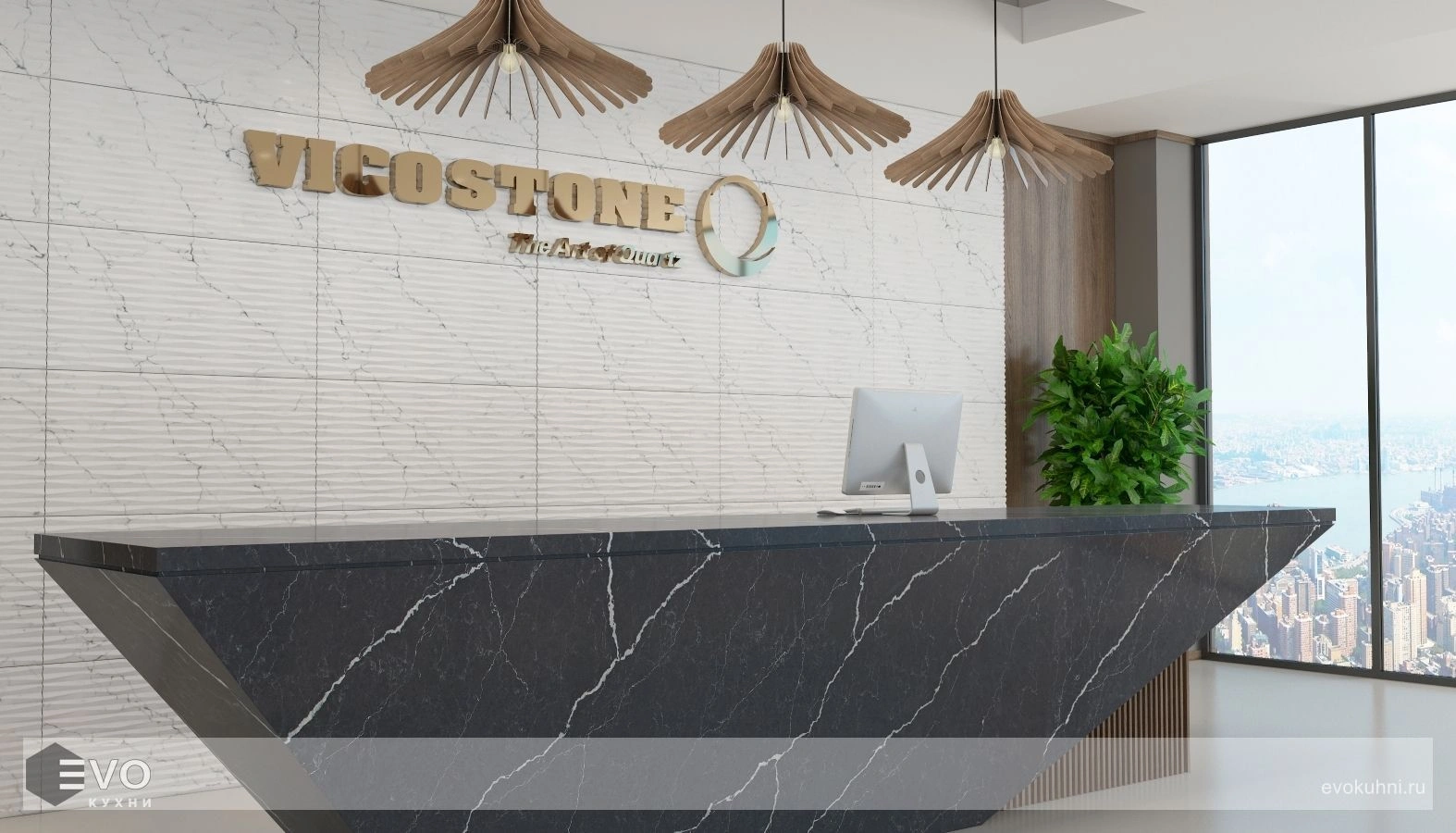 - Влагоустойчивость. Благодаря высокой плотности кварцевого камня Vicostone, никакая жидкость и влага не сможет проникнуть внутрь, поэтому всю воду можно быстро и легко убрать. Искусственный камень после контакта с жидкостями не разрушается, и на нем не останется никаких грязных разводов и пятен.