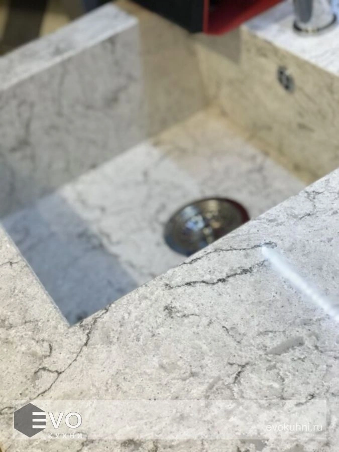 - Кварцевый агломерат не впитывает запахи. Из-за отсутствия пор в материале — запахи не останутся ни от продуктов, ни от помещения, где находится материал. Можно рассыпать, разлить, размазать что угодно на поверхности изделия и не чувствовать въевшийся запах.