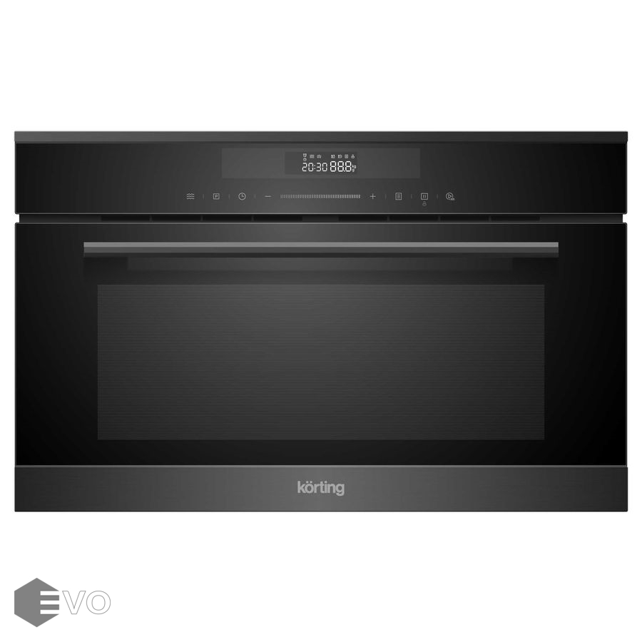Сочетание стекла и стали, горизонтальных линий, используемых в микроволновых печах Korting, объединяет внешний вид кухонной мебели и бытовой техники, создавая полноценное решение в стиле хай-тек.