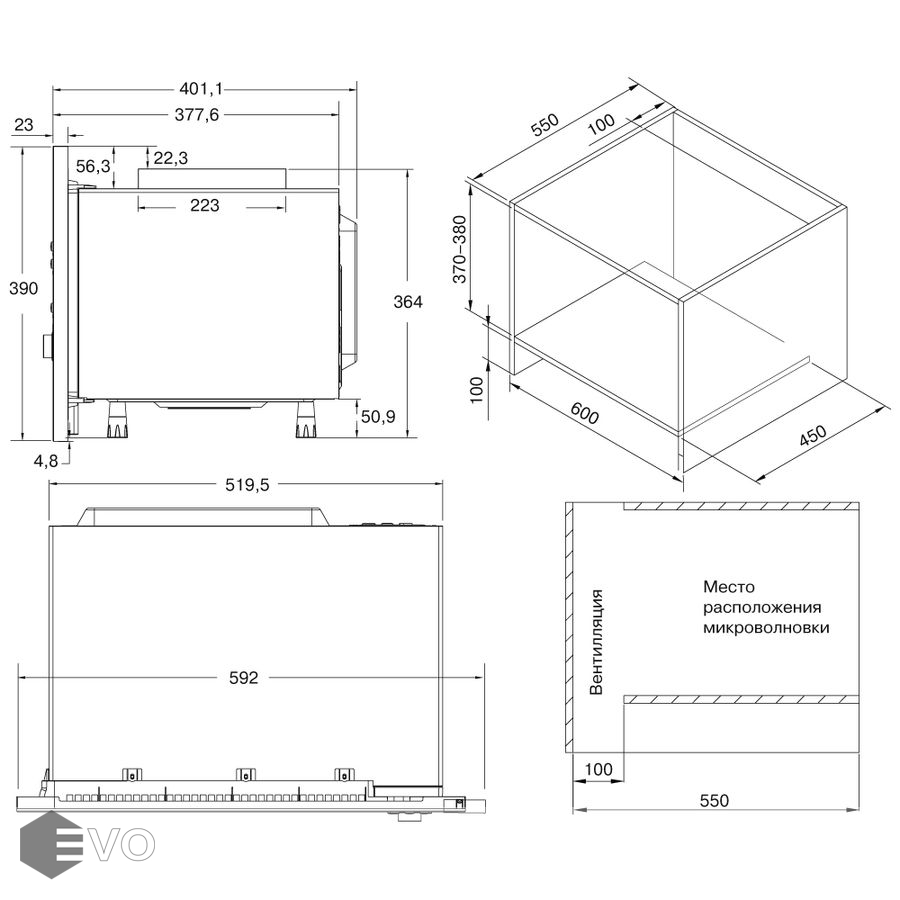 Размеры встраивания (ВхШхГ), мм: 370х600х550