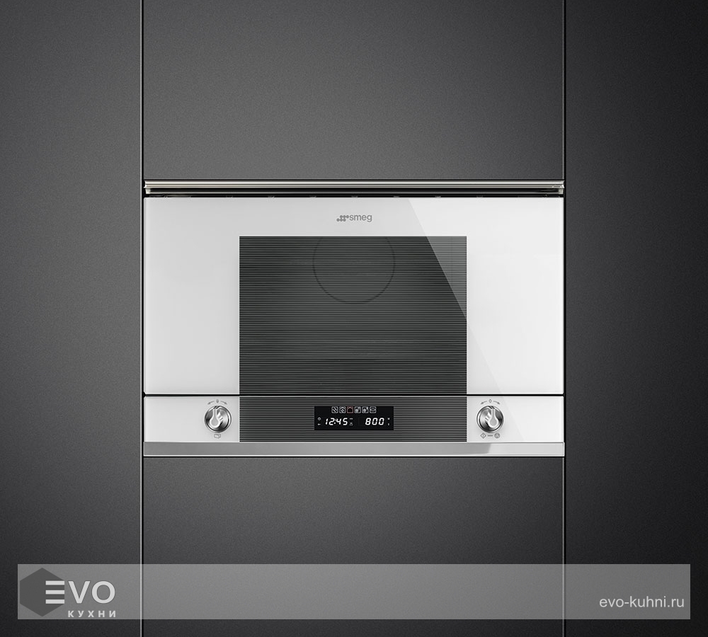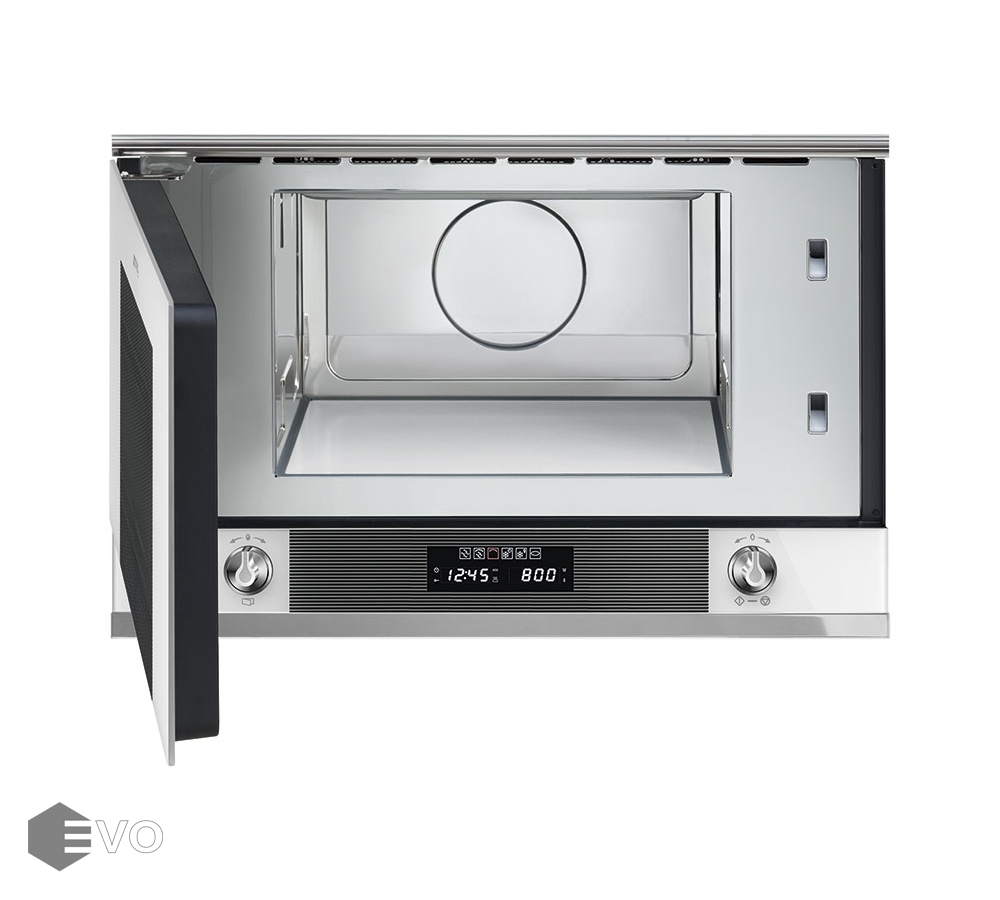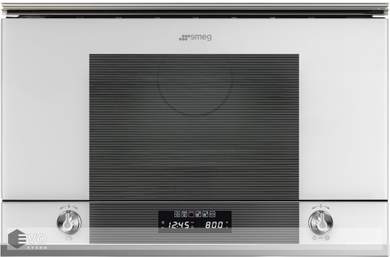 Микроволновая печь Smeg MP122B1 – микроволновая печь оснащена электронным программатором с таймером, возможностью настройки отсрочки включения и автоматическим выключением. Фасад модели выполнен из стекла, горизонтальная нижняя панель управления содержит два сенсорных LЕD-дисплея для выбора параметров работы и два поворотных переключателя с эффектом нержавеющей стали для блокировки панели управления и открывания дверцы.
