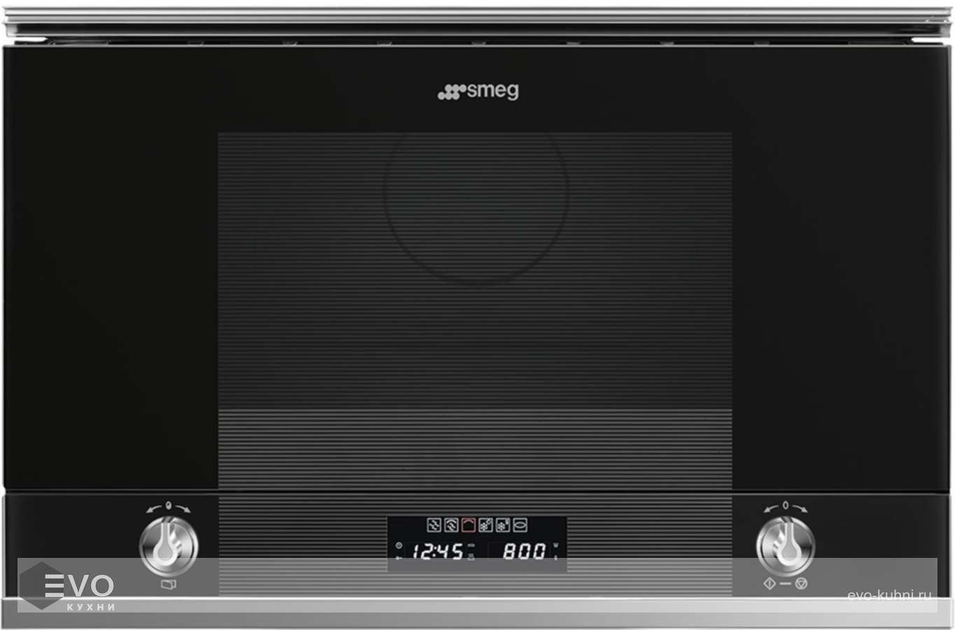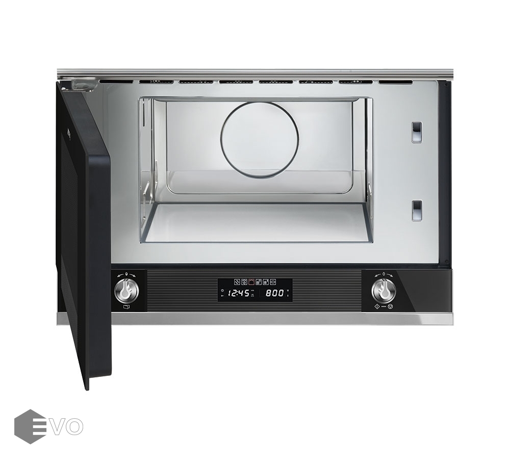 Микроволновая печь Smeg MP122N1 – микроволновая печь оснащена электронным программатором с таймером, возможностью настройки отсрочки включения и автоматическим выключением. Фасад модели выполнен из стекла, горизонтальная нижняя панель управления содержит два сенсорных LЕD-дисплея для выбора параметров работы и два поворотных переключателя с эффектом нержавеющей стали для блокировки панели управления и открывания дверцы.