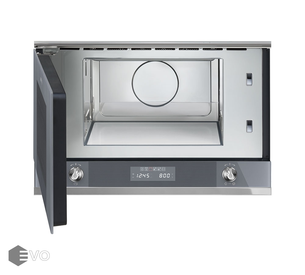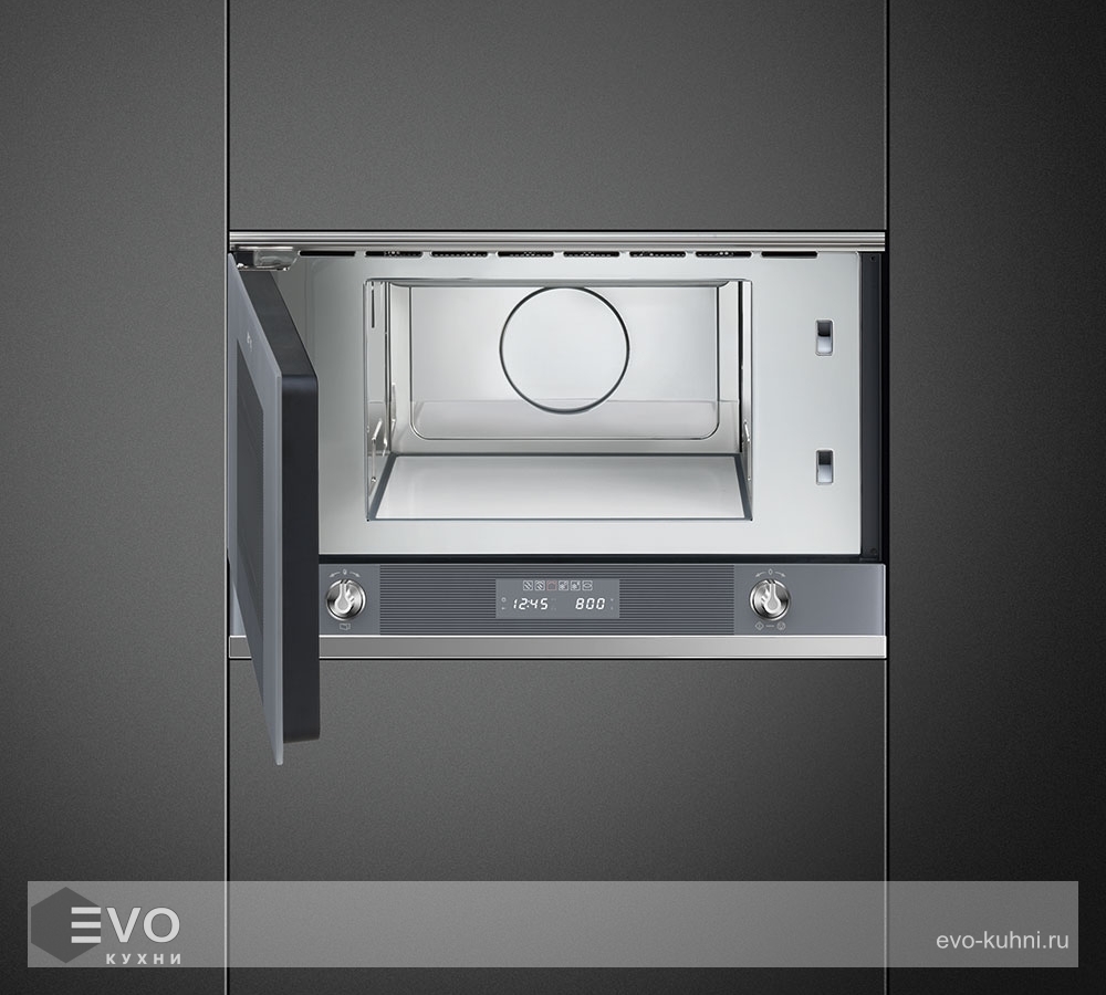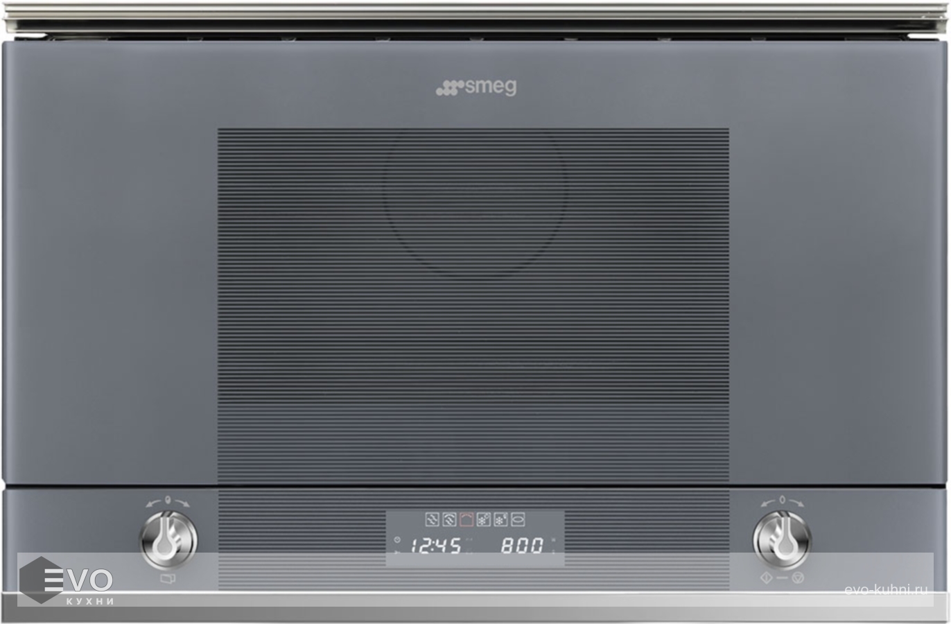 Микроволновая печь Smeg MP122S1 – микроволновая печь оснащена электронным программатором с таймером, возможностью настройки отсрочки включения и автоматическим выключением. Фасад модели выполнен из стекла, горизонтальная нижняя панель управления содержит два сенсорных LЕD-дисплея для выбора параметров работы и два поворотных переключателя с эффектом нержавеющей стали для блокировки панели управления и открывания дверцы.
