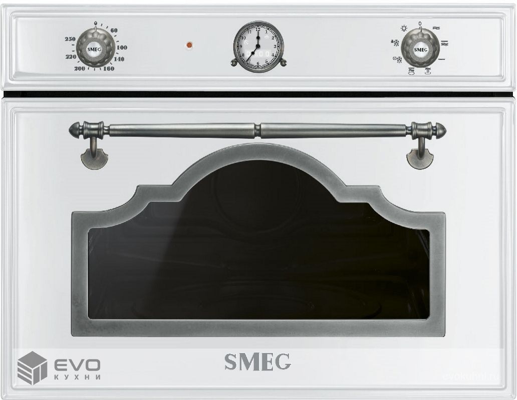 Микроволновая печь Smeg SF4750MBS – печь оборудована грилем и удобной, понятной электронной панелью управления. Фасад дополнен латунной фурнитурой в стиле ретро, стильными аналоговыми часами на панели управления, фигурным стеклом в дверце печи.