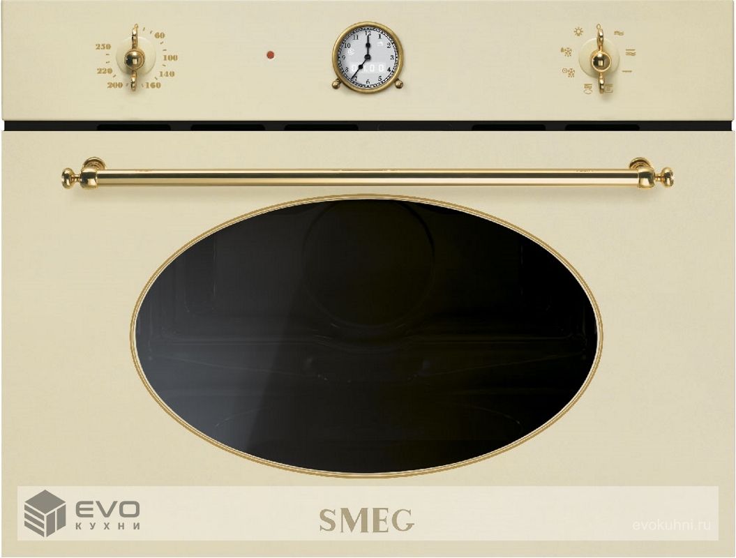 Микроволновая печь Smeg SF4800MP – прибор выполнен в классическом дизайне, декор стилизован под состаренную временем латунь – это функциональная, надежная и красивая бытовая техника для кухни. Режимы разморозки по весу и времени обеспечат комфортное использование. Звуковой сигнал отключения оповестит об окончании программы приготовления.