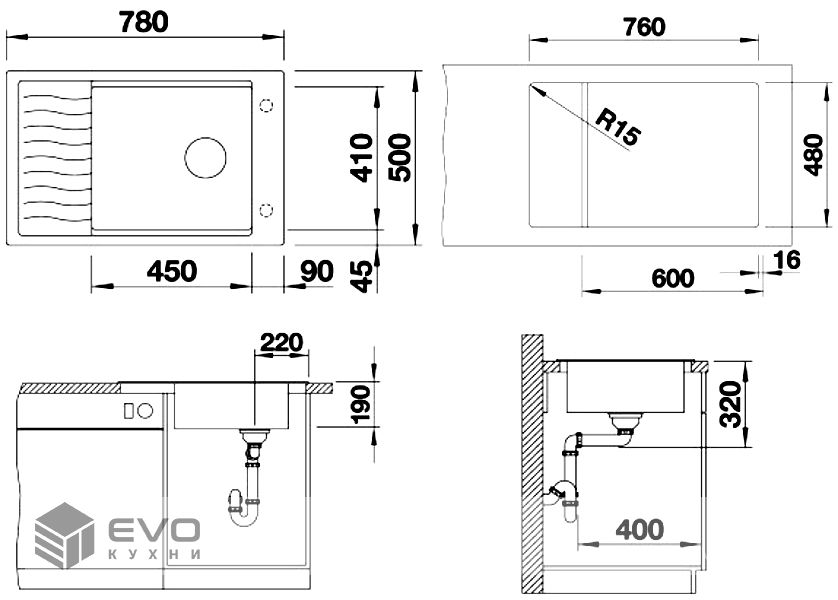 Сверху на столешницу | Мойка устанавливается сверху в предварительно подготовленный вырез в столешнице. |