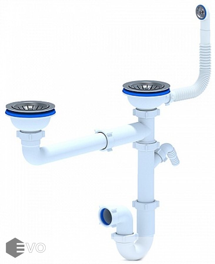 - Комплектация мойки: Сливная арматура с двумя корзинчатыми вентилями 3 1/2", сифон и комплект крепежа