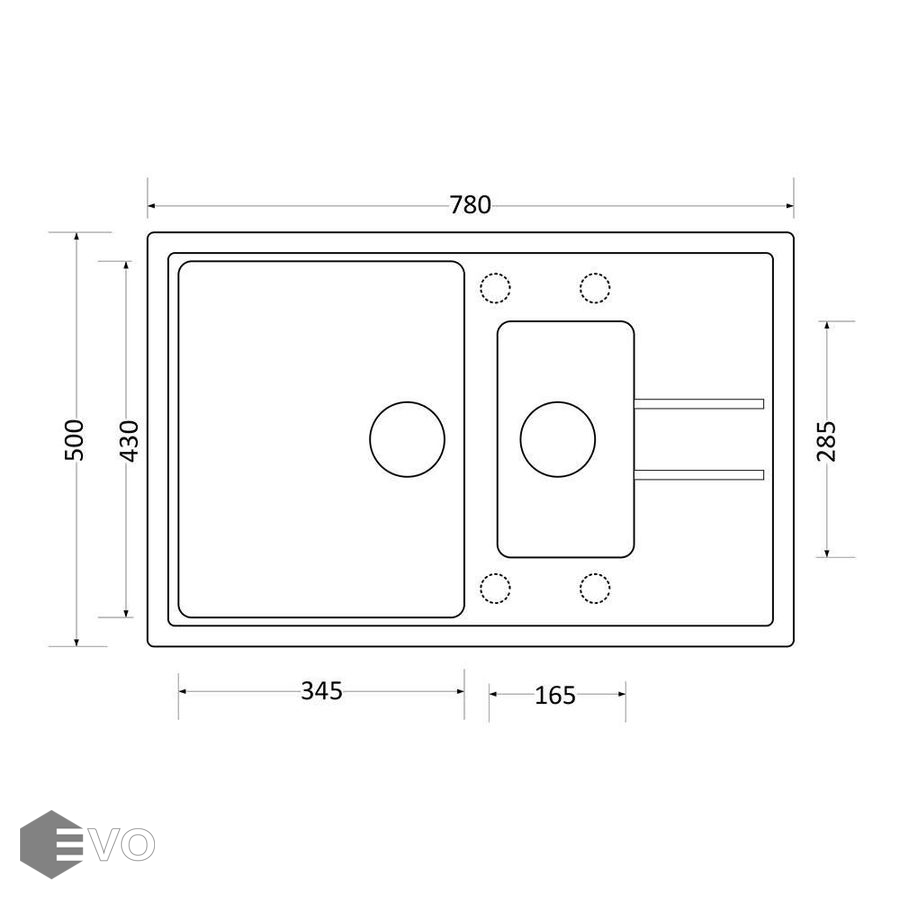 Вместительная чаша большого размера и небольшая дополнительная чаша расположены параллельно друг другу. Крыло-сушилка со сливными желобками служит подставкой для посуды и продуктов.