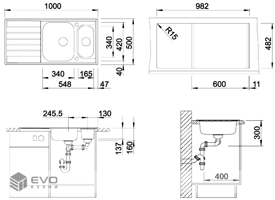 | от 600 мм | Учитывать ширину пристенного канта в случае установки мойки возле стены. |