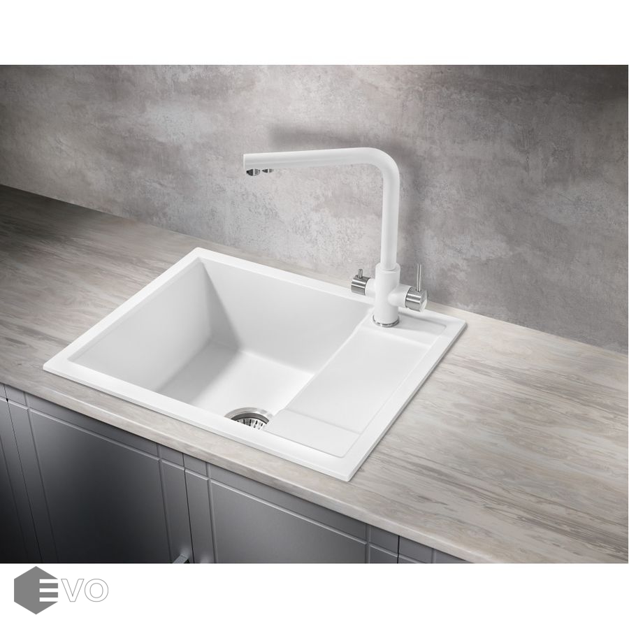Врезная прямоугольная мойка для кухни из искусственного камня MILACIO Navarra 60 Cuarzo (MC.77072), выполненная в белом матовом цвете, станет яркой, привлекающей внимание деталью в вашем кухонном интерьере.