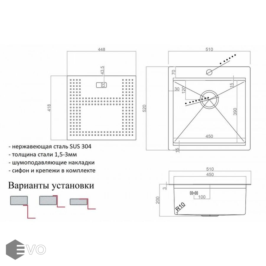 Радиус внутренних углов мойки составляет 10 мм, а глубина чаши 200 мм.