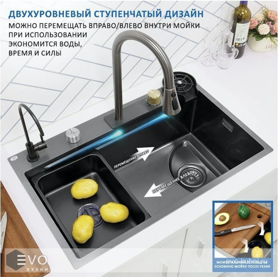 Смещенный в сторону слив в раковине позволит сэкономить значительное пространство в тумбе под мойкой В моечной чаше предусмотрены разноуровневые выступы, благодаря которым можно разместить моечные аксессуары (разделочную доску, мини-мойку и наклонный коландер) для удобства использования на разных уровнях.