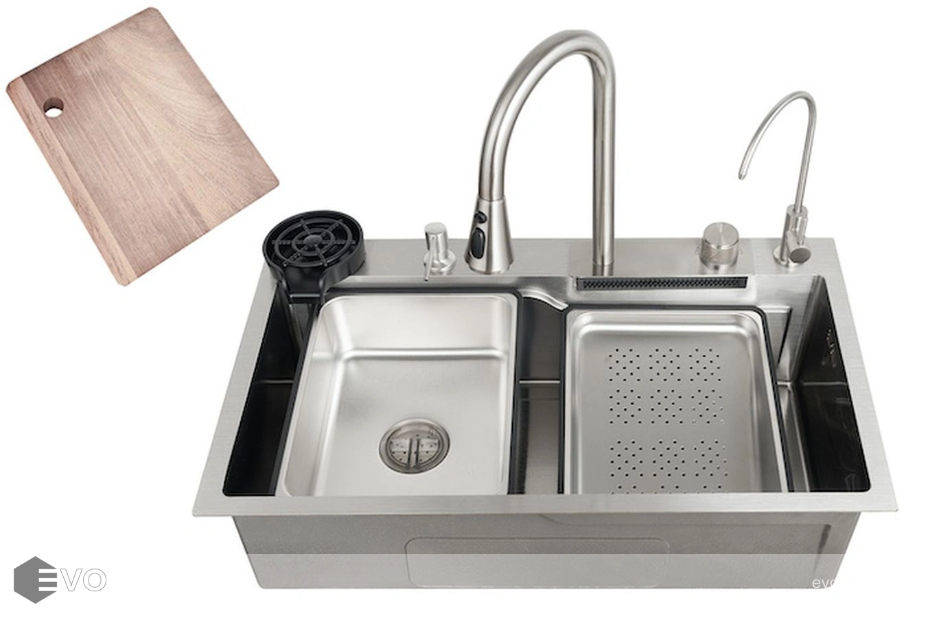 Дозатор моющего средства, питьевой кран и ополаскиватель стаканов, размещенные на кухонной мойке дополняют и без того богатый функционал этой высокотехнологичной кухонной мойки!