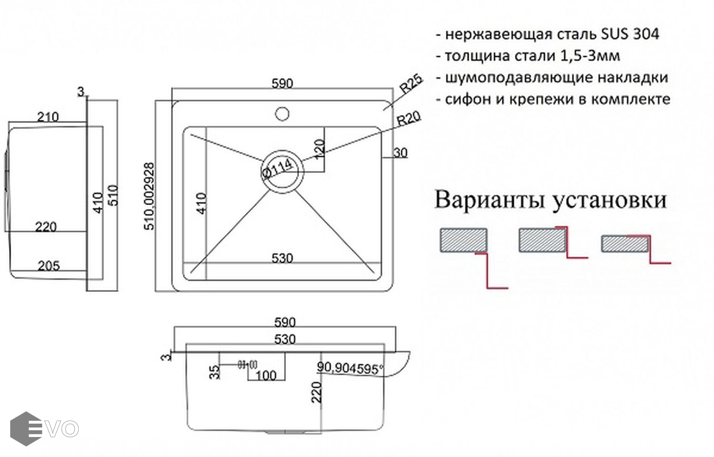 ВАЖНО! Возможны три варианта установки мойки: сверху на столешницу, снизу под столешницу, вровень со столешницей.