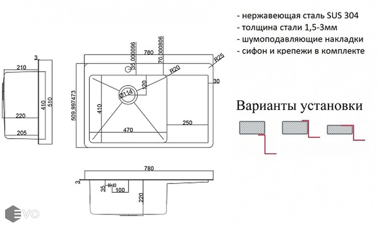 - Размеры мойки (ДхШ) 780х510 мм