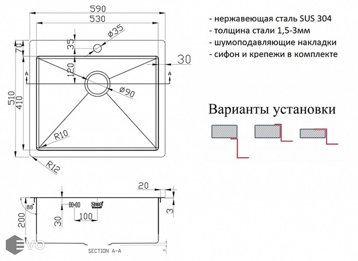 - СПОСОБ УСТАНОВКИ: Сверху на столешницу, Под столешницу, Вровень со столешницей