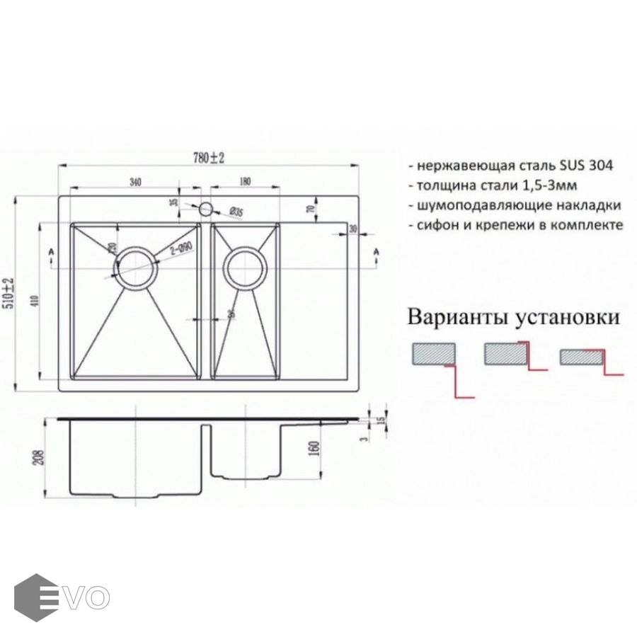 Мойка Zorg R-5178-2-L из нержавеющей стали марки 304 отличается особо большой толщиной верхней поверхности (3 мм) и толщиной стенок (1.5 мм). Кроме этого, тыльная поверхность мойки покрыта полимером для уменьшения возникновения звука от воды.