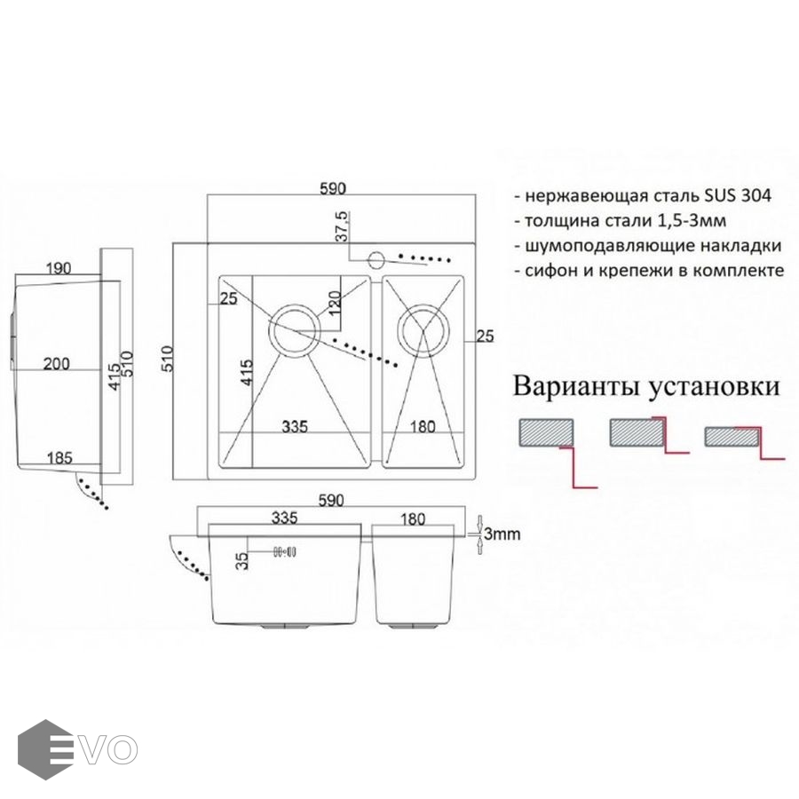 Огромным преимуществом мойки Zorg R 59-2-51 L является её универсальность установки. Вы можете установить данную модель сверху столешницы, вровень или снизу (подстольный монтаж).