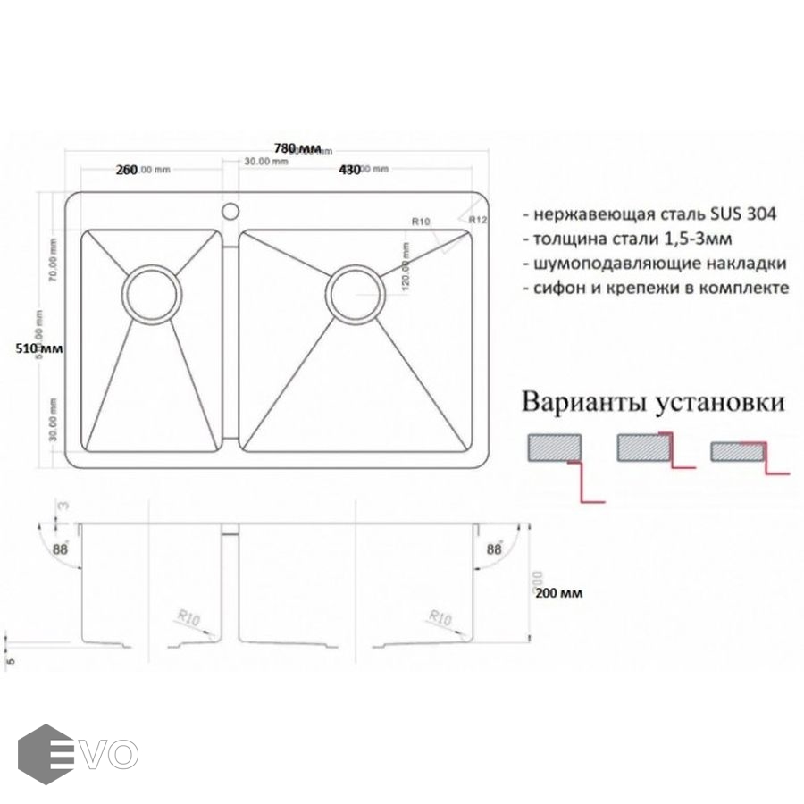 Мойка ZorG R 78-2-51-R из нержавеющей стали марки 304 отличается толщиной верхней поверхности (3 мм) и толщиной стенок (1.5 мм). Кроме этого, тыльная поверхность мойки покрыта полимером для уменьшения возникновения звука от воды.