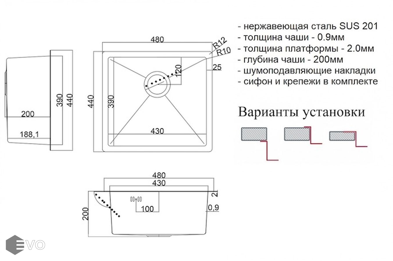 - глубокая вместительная моечная чаша 200 мм с радиусами скруглений R10 мм