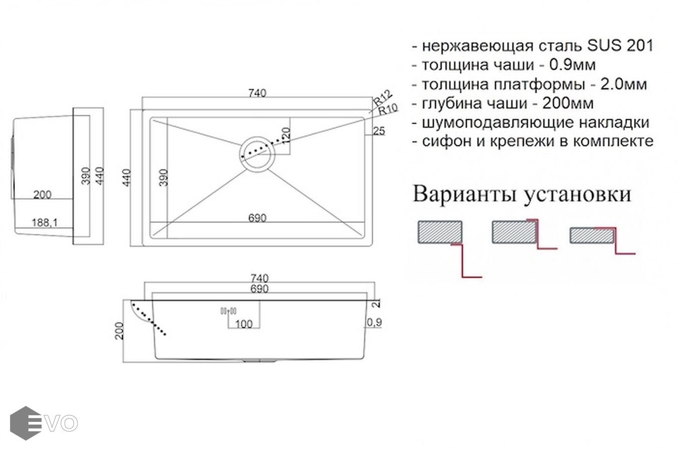 - глубокая вместительная моечная чаша 200 мм с радиусами скруглений R10 мм