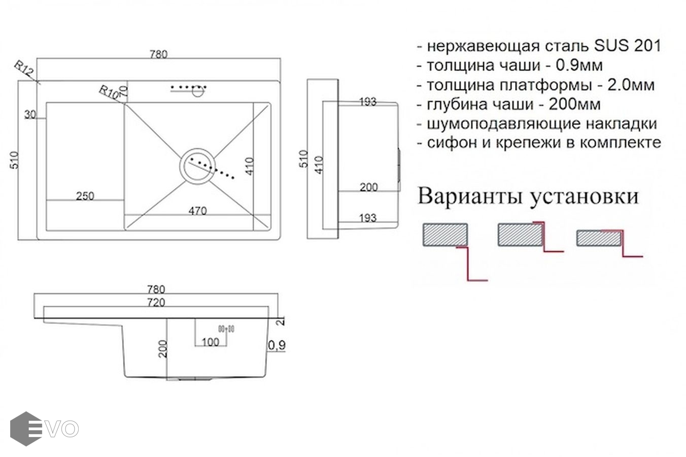 • СПОСОБ УСТАНОВКИ: Сверху на столешницу, Под столешницу, Вровень со столешницей