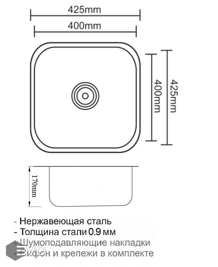 Комплект поставки: Мойка, сливная арматура с корзинчатым вентилем 3 1/2", сифон с отводом, комплект креплений.