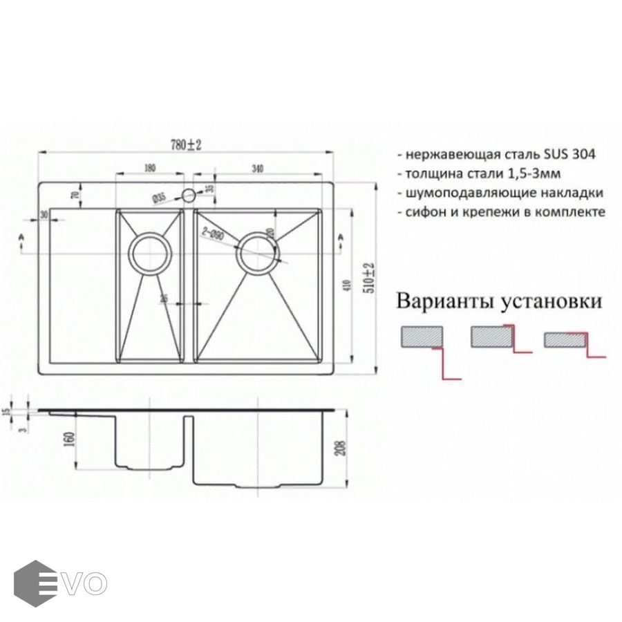 - СПОСОБ УСТАНОВКИ: Сверху на столешницу, Под столешницу, Вровень со столешницей