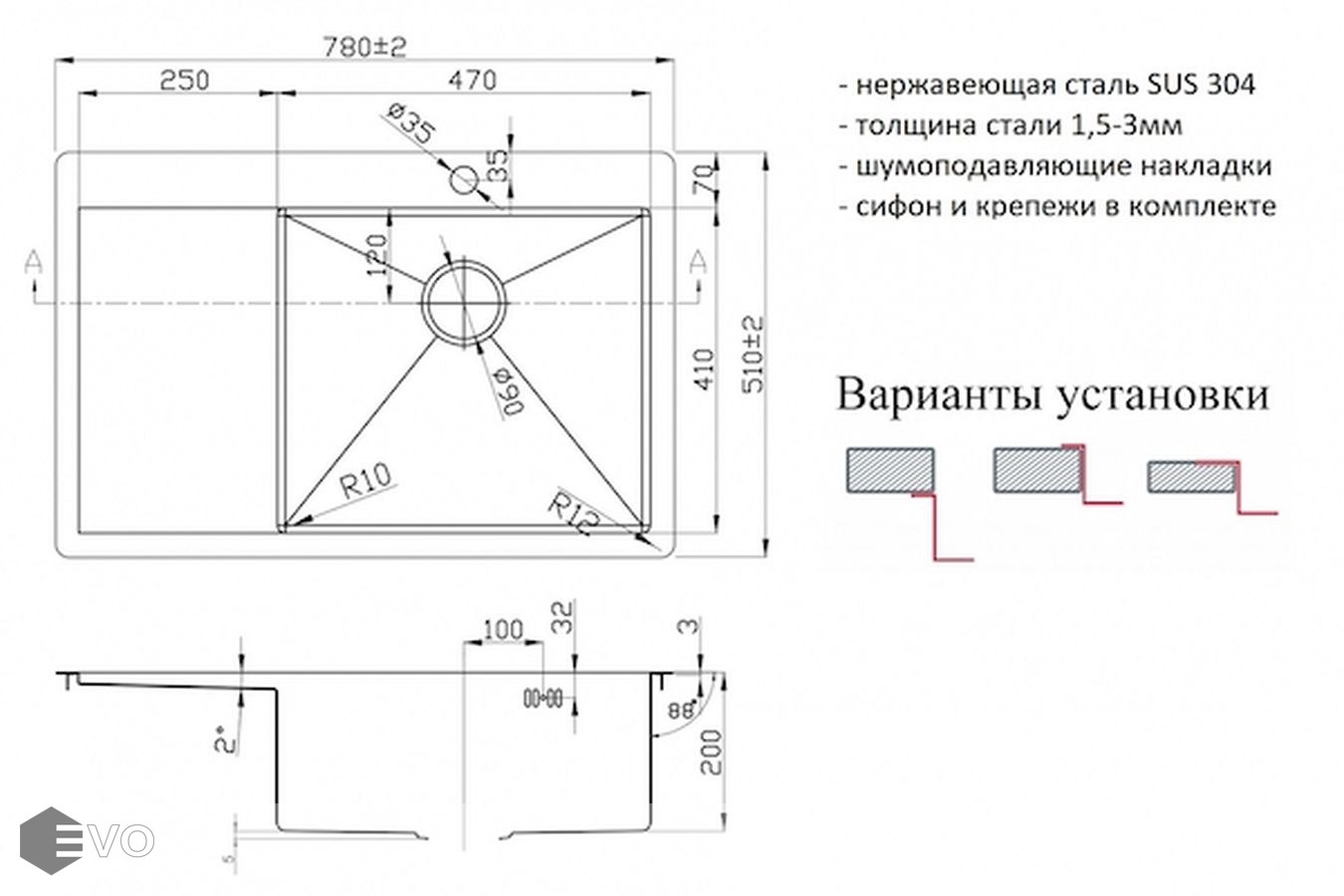 - СПОСОБ УСТАНОВКИ: Сверху на столешницу, Под столешницу, Вровень со столешницей
