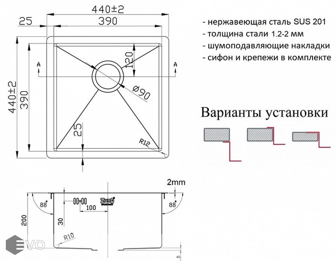 - толщина мойки 1,2 мм (бортик мойки 2 мм)